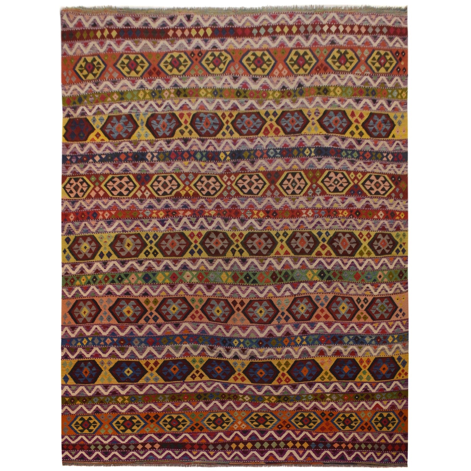 A Beautiful and versatile Oriental rug to decorate your home. This Vegetable Kilim rug is durable and a good investment. It is in perfect condition. The traditional hand-knotted rug is made up of 100% Wool, and measures 9' 9" x 13' 3". It is a rectangle shape rug. The primary color is multi. The collection has the variety of Vegetable Kilim carpets and runners. It is currently in stock. Available in geometric pattern and floral design. Free delivery from 4-6 business days.
