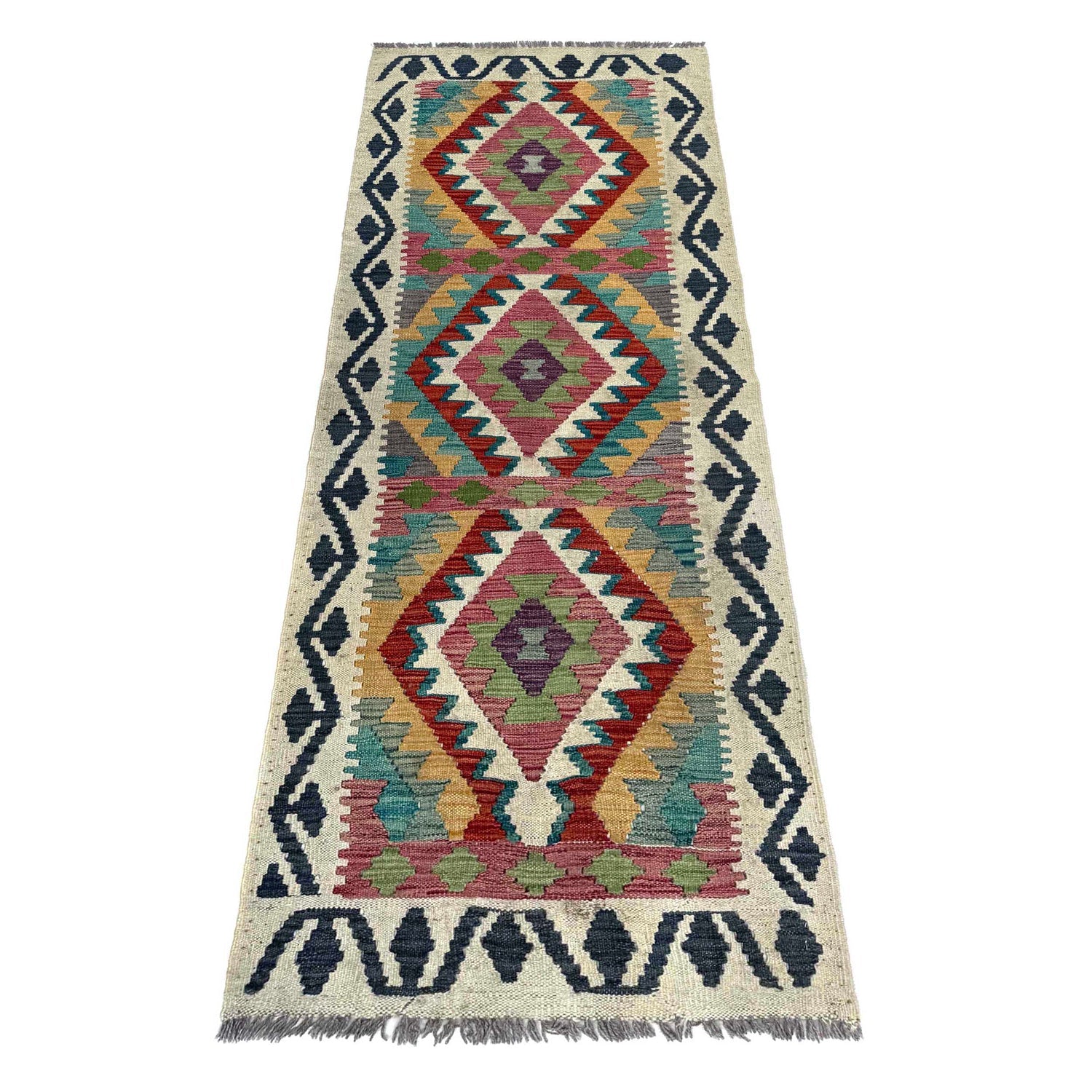 A Beautiful and versatile Oriental rug to decorate your home. This Vegetable Kilim rug is durable and a good investment. It is in perfect condition. The traditional hand-knotted rug is made up of 100% Wool, and measures 2' 0" x 5' 11". It is a rectangle shape rug. The primary color is multi. The collection has the variety of Vegetable Kilim carpets and runners. It is currently in stock. Available in geometric pattern and floral design. Free delivery from 4-6 business days.
