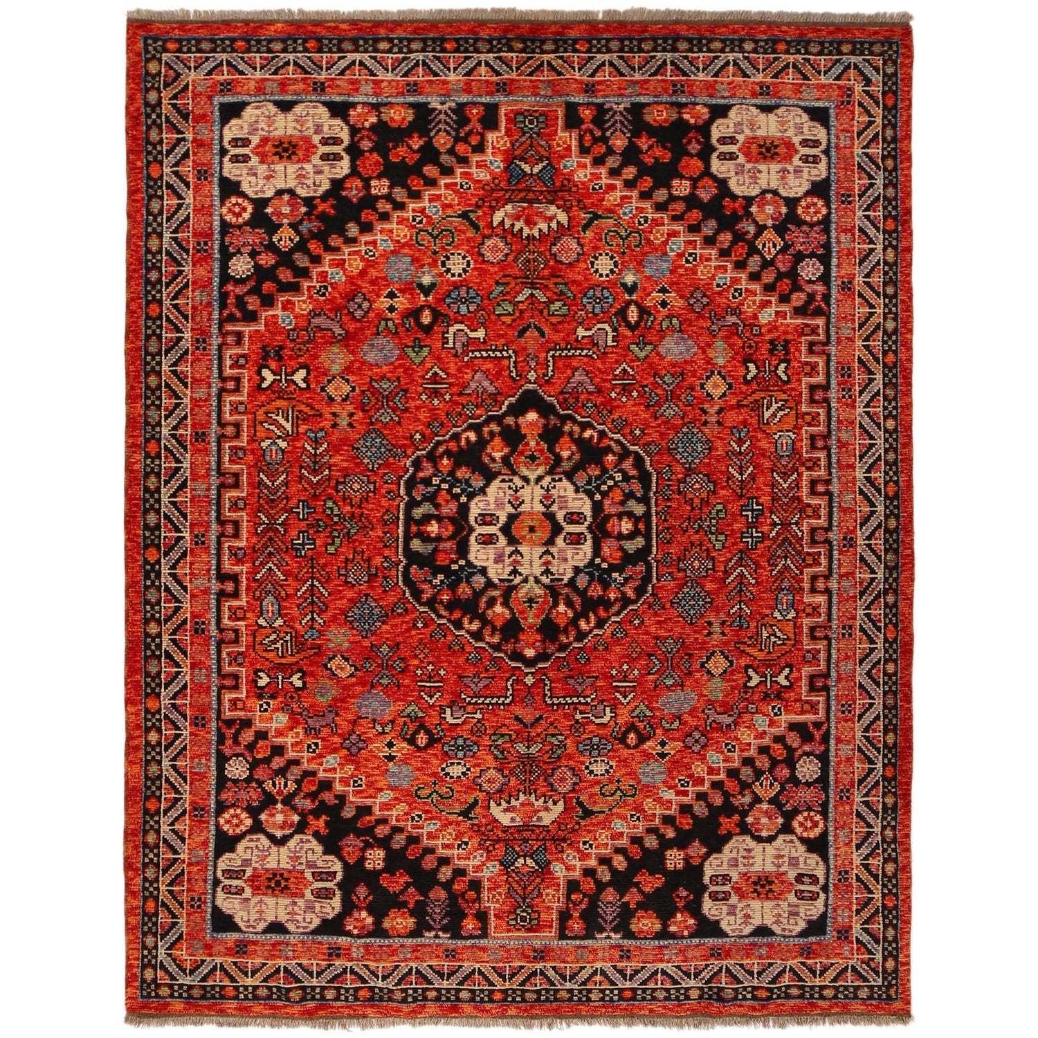 A Beautiful and versatile Oriental rug to decorate your home. This Shirazi rug is durable and a good investment. It is in perfect condition. The traditional hand-knotted rug is made up of 100% Wool, and measures 5' 11" x 7' 8". It is a rectangle shape rug. The primary color is red. The collection has the variety of Shirazi carpets and runners. It is currently in stock. Available in geometric pattern and floral design. Free delivery from 4-6 business days.