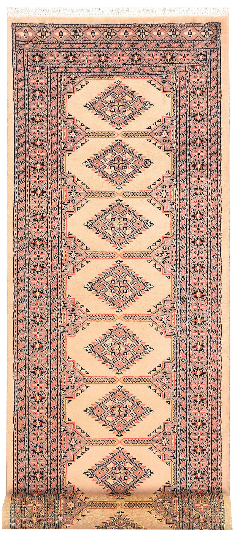 A Beautiful and versatile Oriental rug to decorate your home. This Jaldar rug is durable and a good investment. It is in perfect condition. The traditional hand-knotted rug is made up of wool, and measures 2' 7" x 8' 10". It is a runner shape rug. The primary color is white . The collection has the variety of Jaldar carpets and runners. It is currently in stock. Available in geometric pattern and floral design. Free delivery from 4-6 business days.