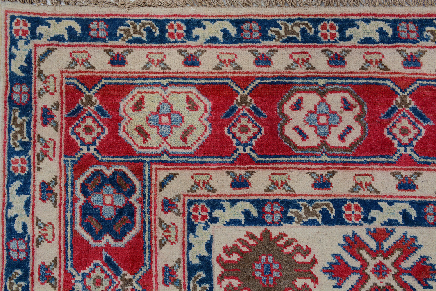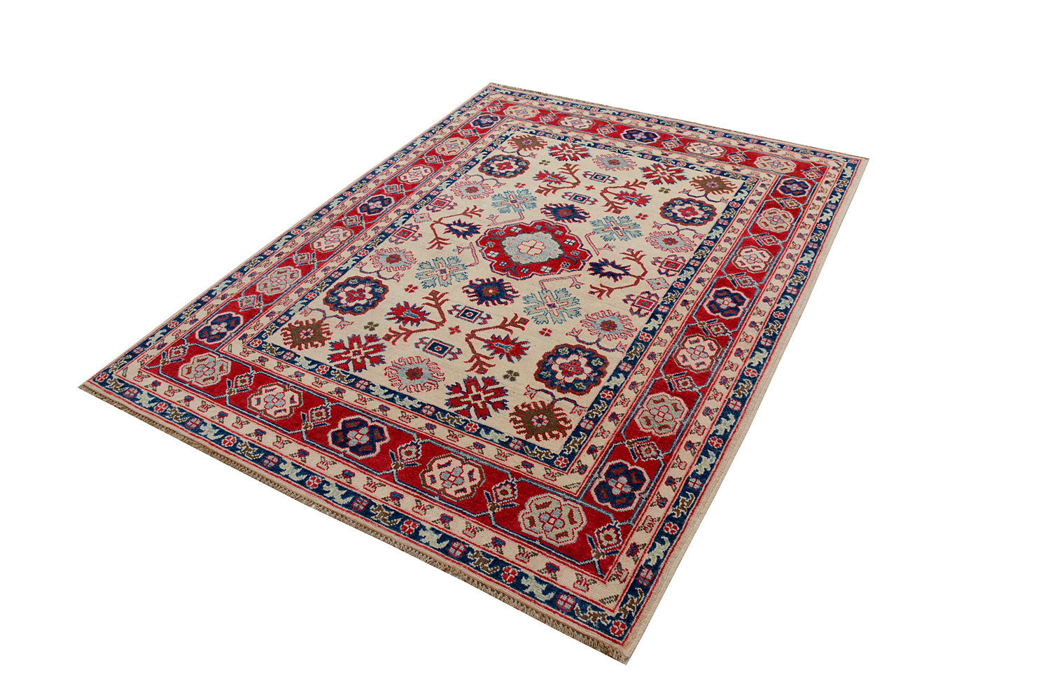 A Beautiful and versatile Oriental rug to decorate your home. This Kazak rug is durable and a good investment. It is in perfect condition. The traditional hand-knotted rug is made up of wool, and measures 4' 11" x 6' 6". It is a rectangle shape rug. The primary color is white . The collection has the variety of Kazak carpets and runners. It is currently in stock. Available in geometric pattern and floral design. Free delivery from 4-6 business days.