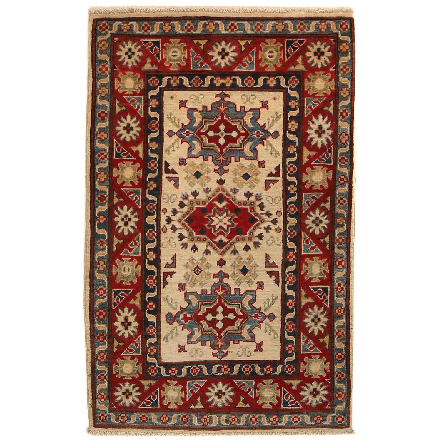 A Beautiful and versatile Oriental rug to decorate your home. This Kazak rug is durable and a good investment. It is in perfect condition. The traditional hand-knotted rug is made up of Wool on Cotton, and measures 2' 7" x 4' 0". It is a rectangle shape rug. The primary color is beige. The collection has the variety of Kazak carpets and runners. It is currently in stock. Available in geometric pattern and floral design. Free delivery from 4-6 business days.
