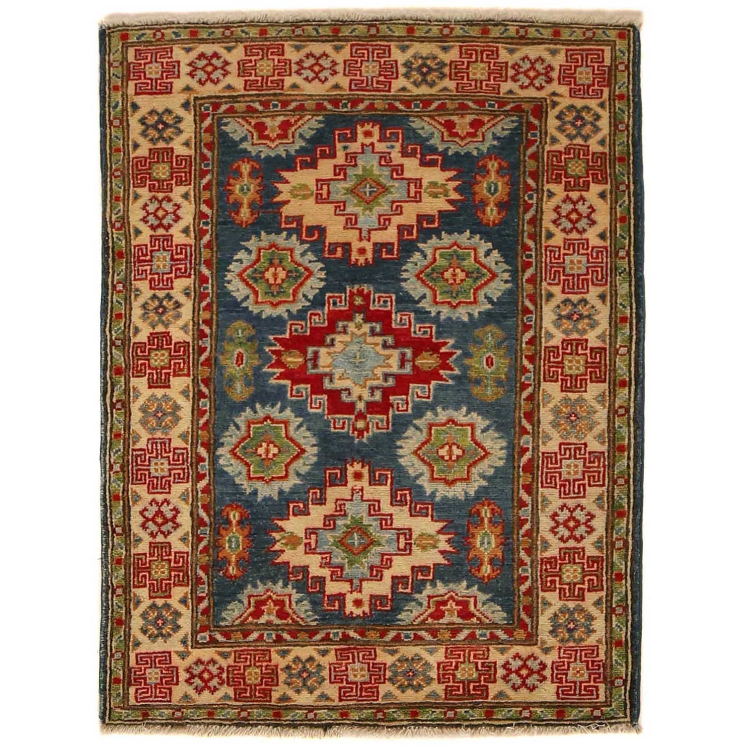 A Beautiful and versatile Oriental rug to decorate your home. This Kazak rug is durable and a good investment. It is in perfect condition. The traditional hand-knotted rug is made up of Wool on Cotton, and measures 2' 9" x 4' 8". It is a rectangle shape rug. The primary color is blue . The collection has the variety of Kazak carpets and runners. It is currently in stock. Available in geometric pattern and floral design. Free delivery from 4-6 business days.