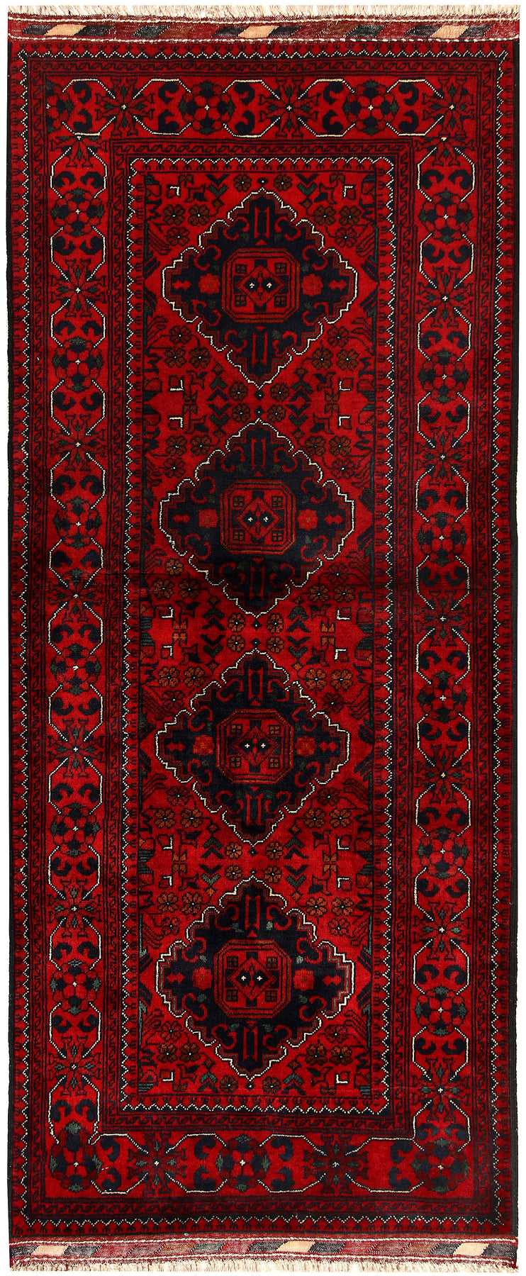 A Beautiful and versatile Oriental rug to decorate your home. This Khal Mohammadi rug is durable and a good investment. It is in perfect condition. The traditional hand-knotted rug is made up of wool, and measures 2' 7" x 6' 3". It is a runner shape rug. The primary color is red . The collection has the variety of Khal Mohammadi carpets and runners. It is currently in stock. Available in geometric pattern and floral design. Free delivery from 4-6 business days.
