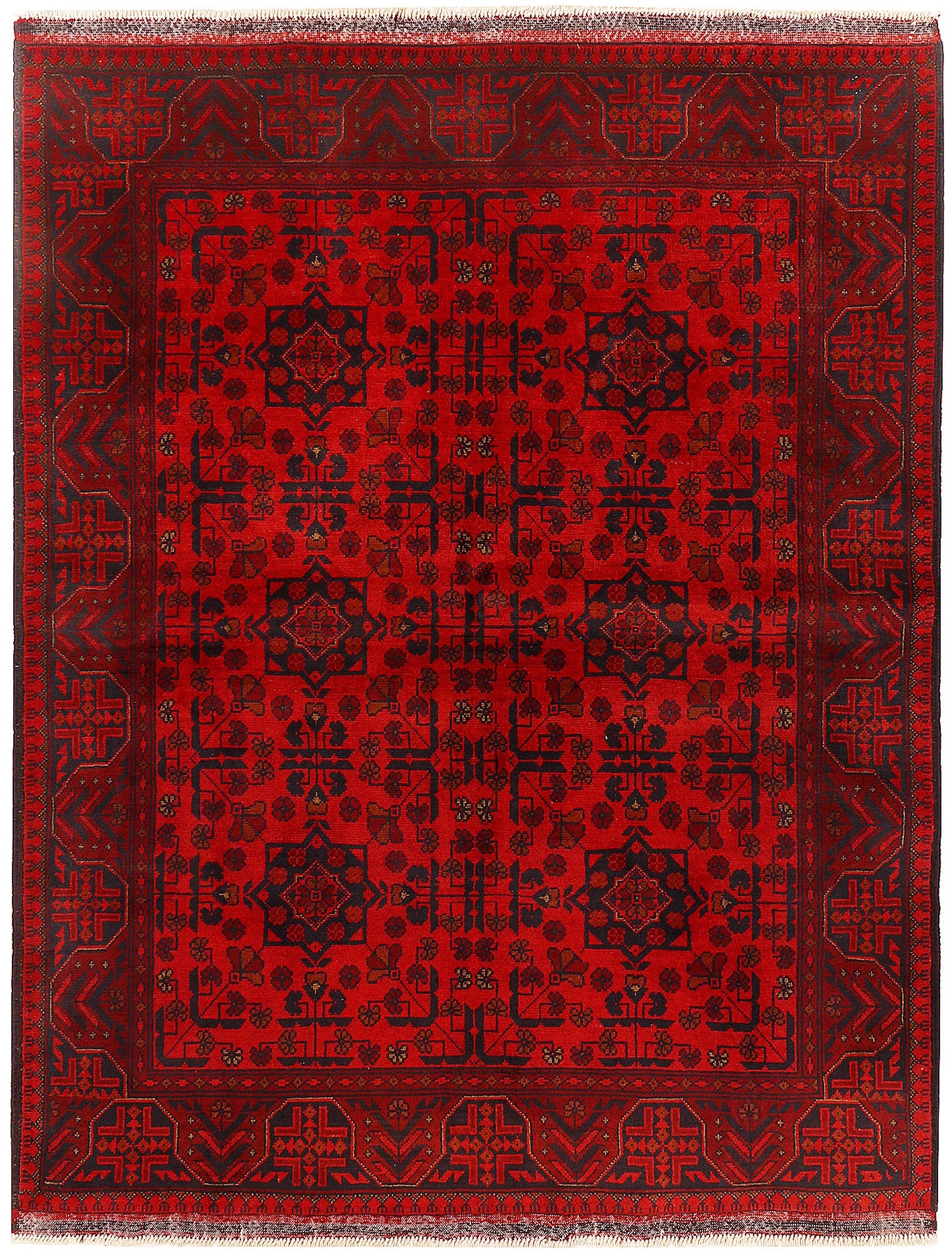 A Beautiful and versatile Oriental rug to decorate your home. This Khal Mohammadi rug is durable and a good investment. It is in perfect condition. The traditional hand-knotted rug is made up of wool, and measures 4' 11" x 6' 4". It is a rectangle shape rug. The primary color is red . The collection has the variety of Khal Mohammadi carpets and runners. It is currently in stock. Available in geometric pattern and floral design. Free delivery from 4-6 business days.