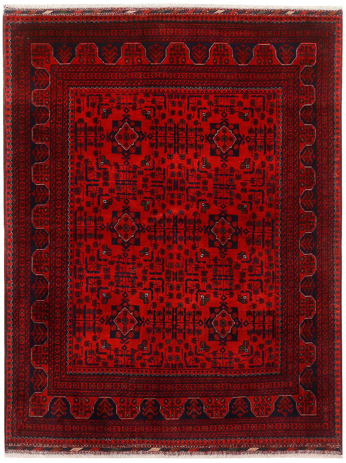 A Beautiful and versatile Oriental rug to decorate your home. This Khal Mohammadi rug is durable and a good investment. It is in perfect condition. The traditional hand-knotted rug is made up of wool, and measures 4' 8" x 6' 5". It is a rectangle shape rug. The primary color is red . The collection has the variety of Khal Mohammadi carpets and runners. It is currently in stock. Available in geometric pattern and floral design. Free delivery from 4-6 business days.