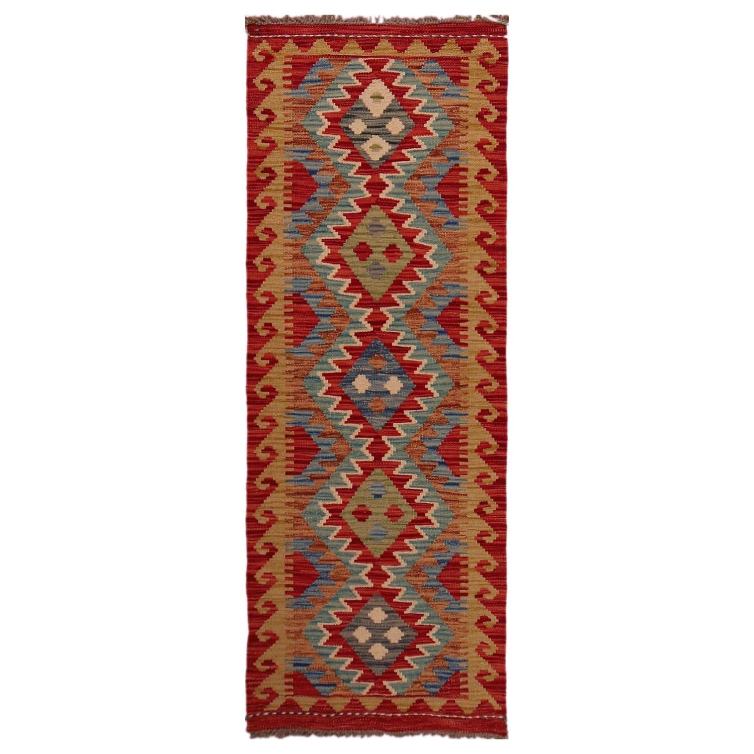 A Beautiful and versatile Oriental rug to decorate your home. This Vegetable Kilim rug is durable and a good investment. It is in perfect condition. The traditional hand-knotted rug is made up of 100% Wool, and measures 1' 10" x 4' 11". It is a rectangle shape rug. The primary color is multi. The collection has the variety of Vegetable Kilim carpets and runners. It is currently in stock. Available in geometric pattern and floral design. Free delivery from 4-6 business days.