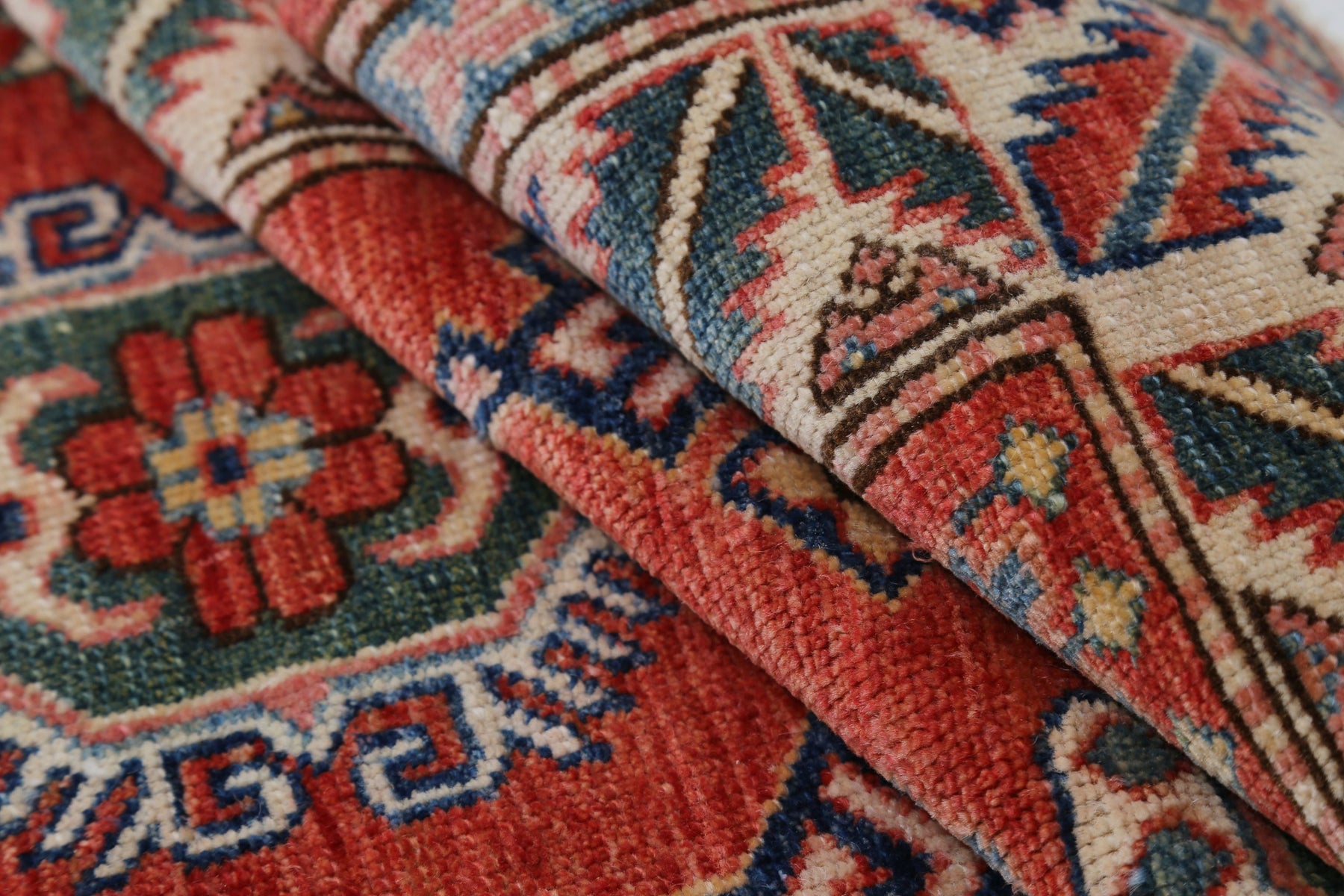 Also know as a "Royal" / "Super" Kazak, they are a form of tribal rug that has its roots in the Caucasus Mountains, which divide Europe and Asia. The rugs made by the nomadic Kazak people, who have been residing in the area for millennia, depict their way of life.