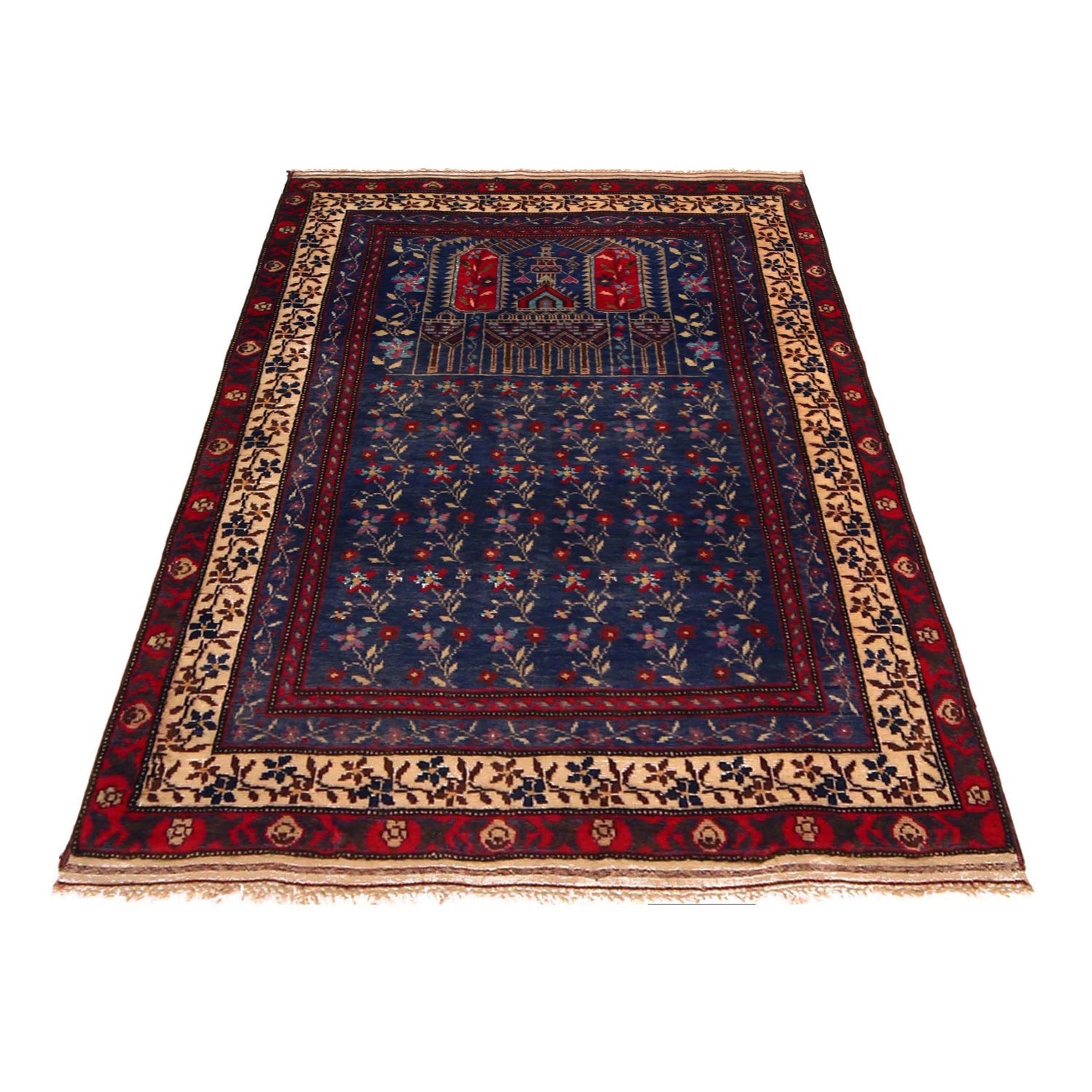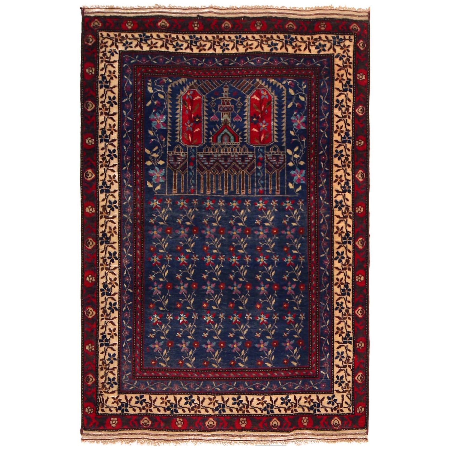 A Beautiful and versatile Oriental rug to decorate your home. This Prayer Rug rug is durable and a good investment. It is in perfect condition. The traditional hand-knotted rug is made up of 100% Wool, and measures 3' 1" x 4' 7". It is a rectangle shape rug. The primary color is blue. The collection has the variety of Prayer Rug carpets and runners. It is currently in stock. Available in geometric pattern and floral design. Free delivery from 4-6 business days.