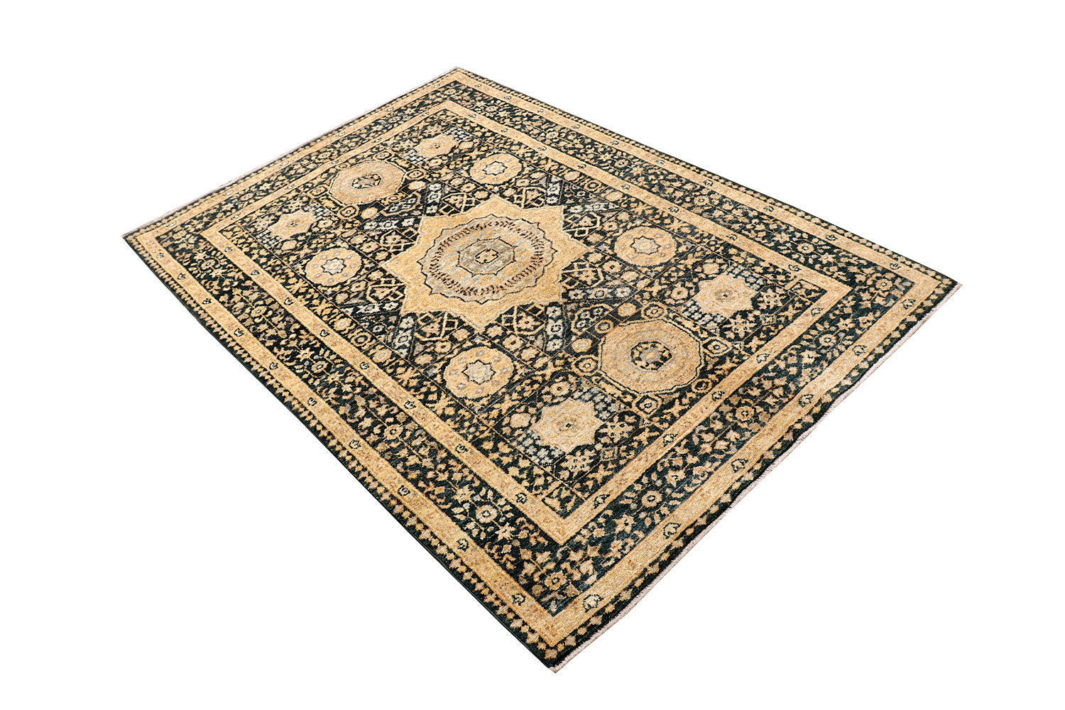 A Beautiful and versatile Oriental rug to decorate your home. This Mamluk rug is durable and a good investment. It is in perfect condition. The traditional hand-knotted rug is made up of wool, and measures 4' 1" x 5' 11". It is a rectangle shape rug. The primary color is multi-colored . The collection has the variety of Mamluk carpets and runners. It is currently in stock. Available in geometric pattern and floral design. Free delivery from 4-6 business days.