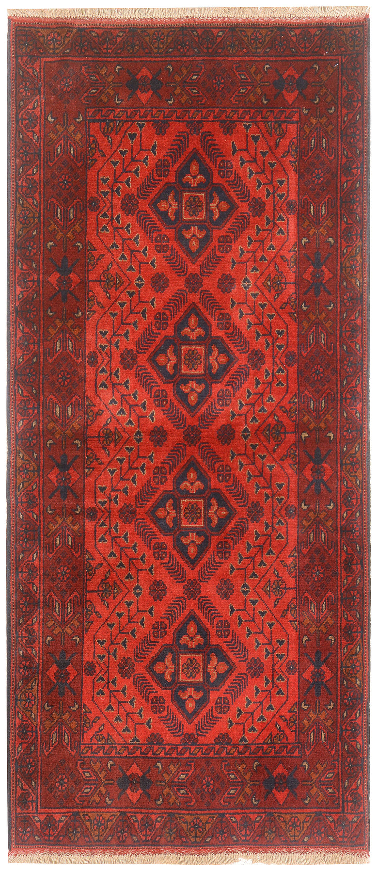 A Beautiful and versatile Oriental rug to decorate your home. This Khal Mohammadi rug is durable and a good investment. It is in perfect condition. The traditional hand-knotted rug is made up of wool, and measures 2' 9" x 6' 3". It is a runner shape rug. The primary color is red . The collection has the variety of Khal Mohammadi carpets and runners. It is currently in stock. Available in geometric pattern and floral design. Free delivery from 4-6 business days.