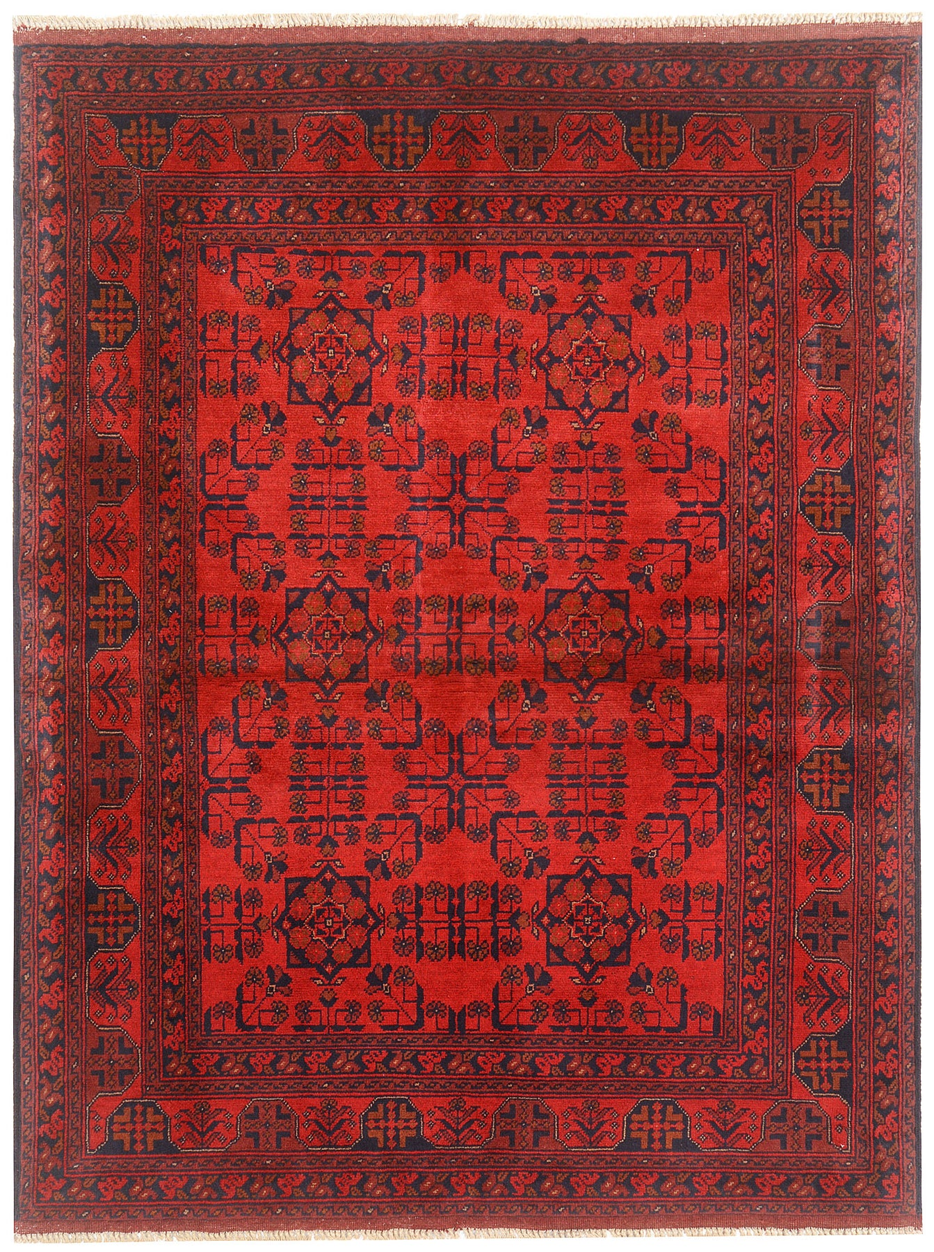 A Beautiful and versatile Oriental rug to decorate your home. This Khal Mohammadi rug is durable and a good investment. It is in perfect condition. The traditional hand-knotted rug is made up of wool, and measures 4' 10" x 6' 7". It is a rectangle shape rug. The primary color is red . The collection has the variety of Khal Mohammadi carpets and runners. It is currently in stock. Available in geometric pattern and floral design. Free delivery from 4-6 business days.