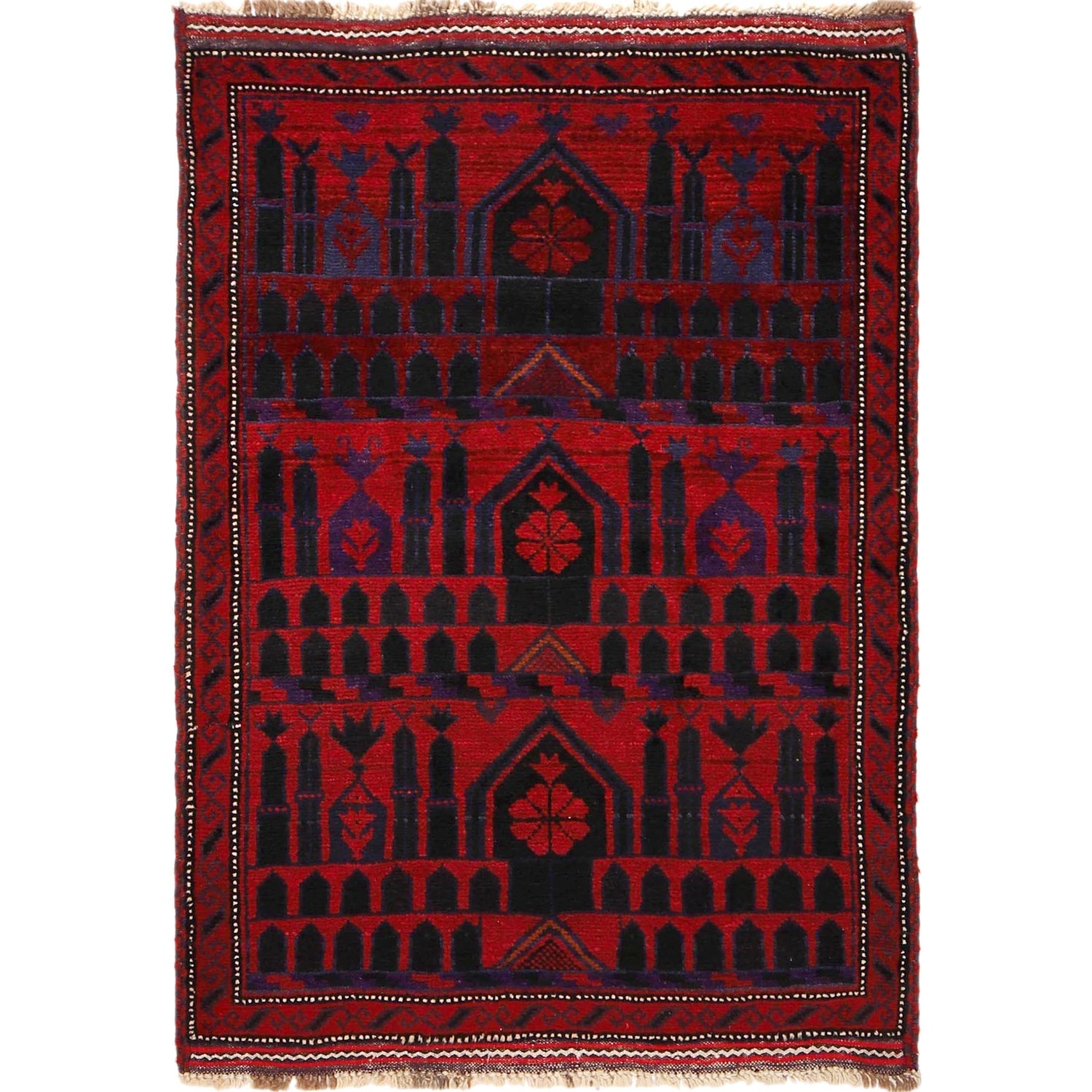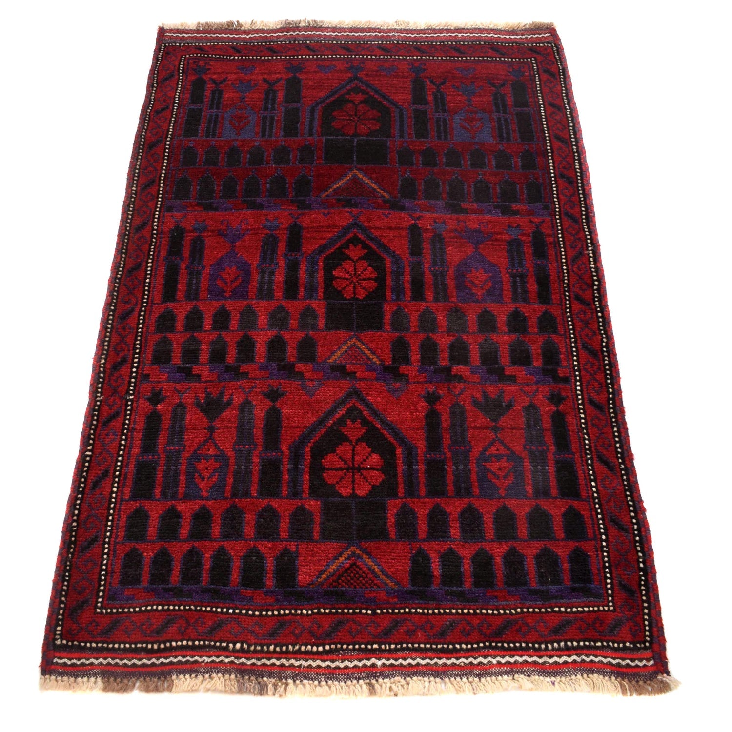 A Beautiful and versatile Oriental rug to decorate your home. This Baluchi rug is durable and a good investment. It is in perfect condition. The traditional hand-knotted rug is made up of 100% Wool, and measures 3' 1" x 4' 6". It is a rectangle shape rug. The primary color is red. The collection has the variety of Baluchi carpets and runners. It is currently in stock. Available in geometric pattern and floral design. Free delivery from 4-6 business days.