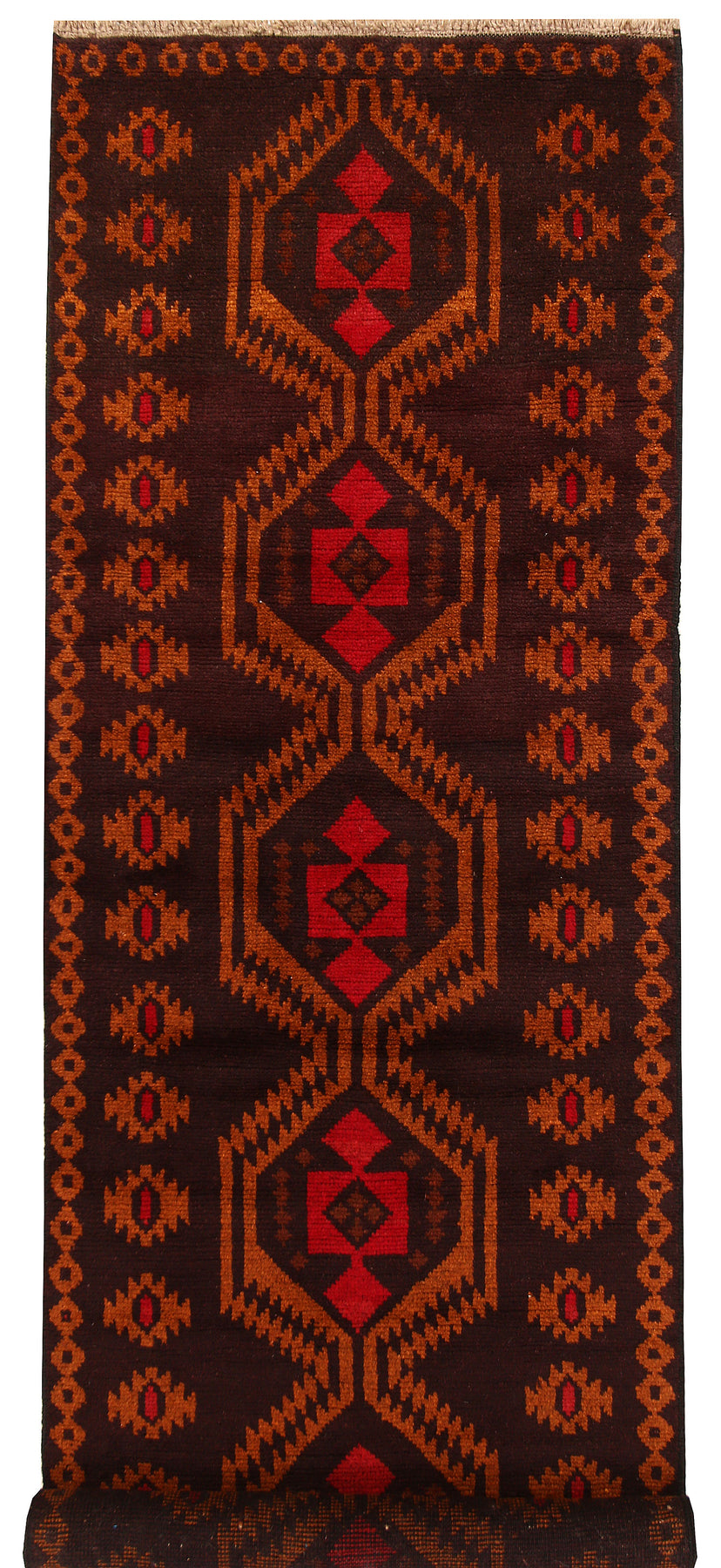 A Beautiful and versatile Oriental rug to decorate your home. This Baluchi rug is durable and a good investment. It is in perfect condition. The traditional hand-knotted rug is made up of wool, and measures 2' 6" x 8' ". It is a runner shape rug. The primary color is brown . The collection has the variety of Baluchi carpets and runners. It is currently in stock. Available in geometric pattern and floral design. Free delivery from 4-6 business days.