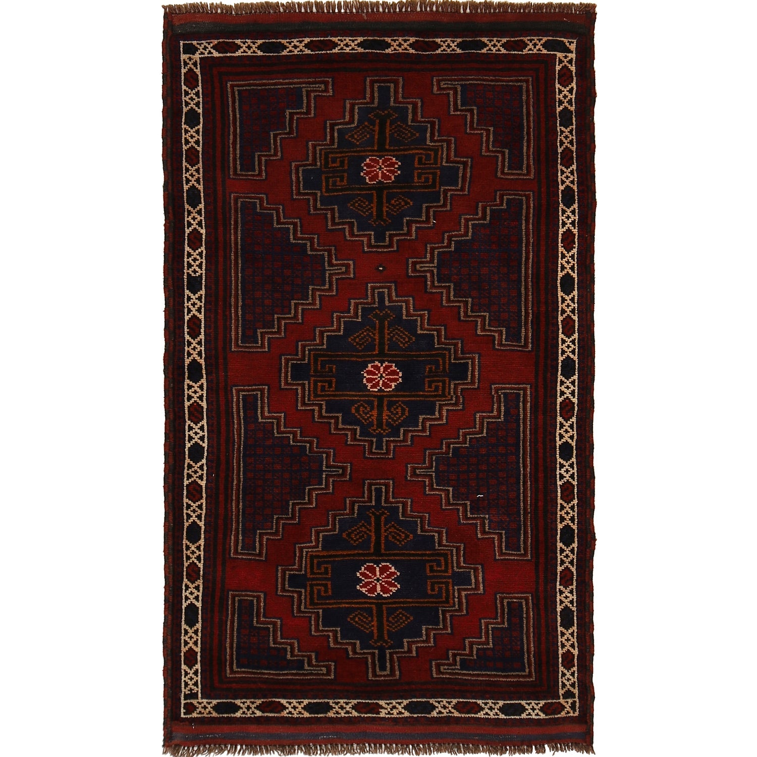 A Beautiful and versatile Oriental rug to decorate your home. This Baluchi rug is durable and a good investment. It is in perfect condition. The traditional hand-knotted rug is made up of 100% Wool, and measures 2' 9" x 4' 10". It is a rectangle shape rug. The primary color is red. The collection has the variety of Baluchi carpets and runners. It is currently in stock. Available in geometric pattern and floral design. Free delivery from 4-6 business days.