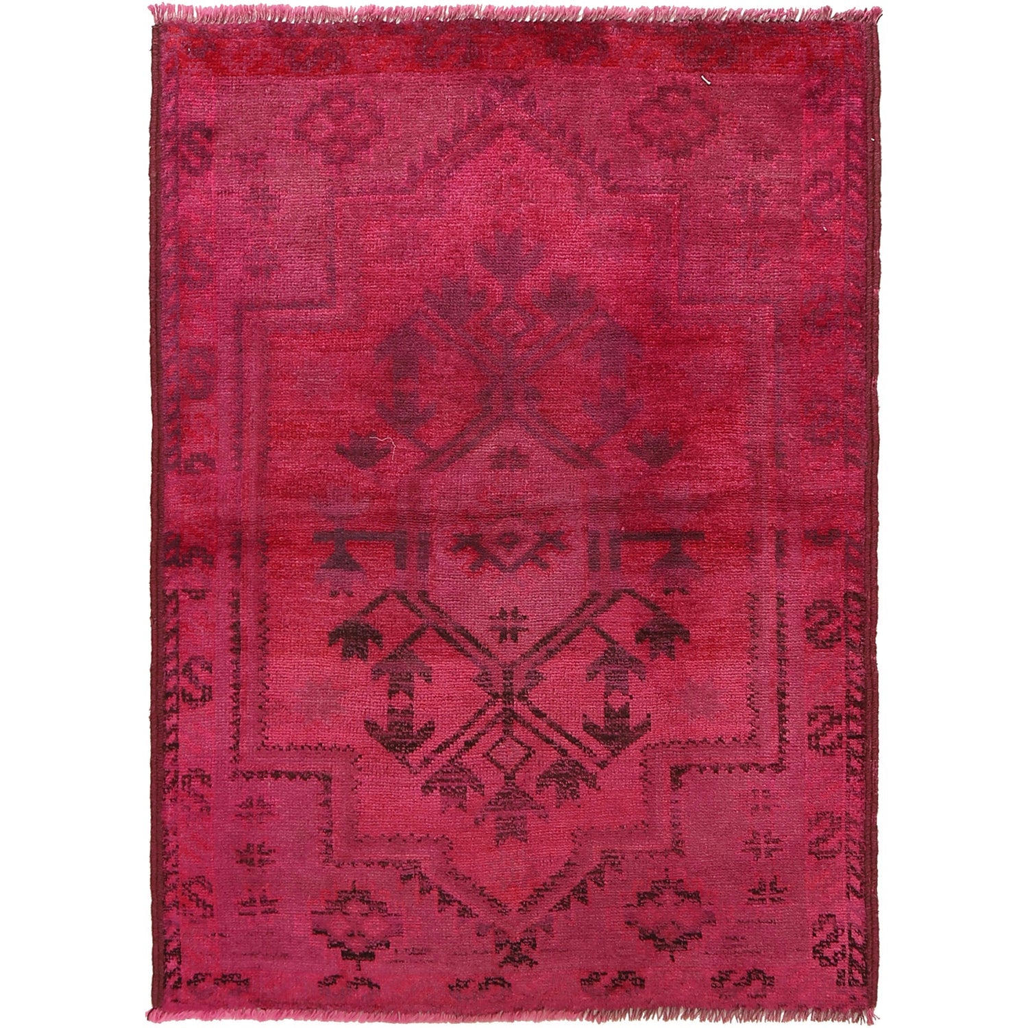 A Beautiful and versatile Oriental rug to decorate your home. This Overdyed rug is durable and a good investment. It is in perfect condition. The traditional hand-knotted rug is made up of 100% Wool, and measures 3' 2" x 4' 3". It is a rectangle shape rug. The primary color is pink. The collection has the variety of Overdyed carpets and runners. It is currently in stock. Available in geometric pattern and floral design. Free delivery from 4-6 business days.