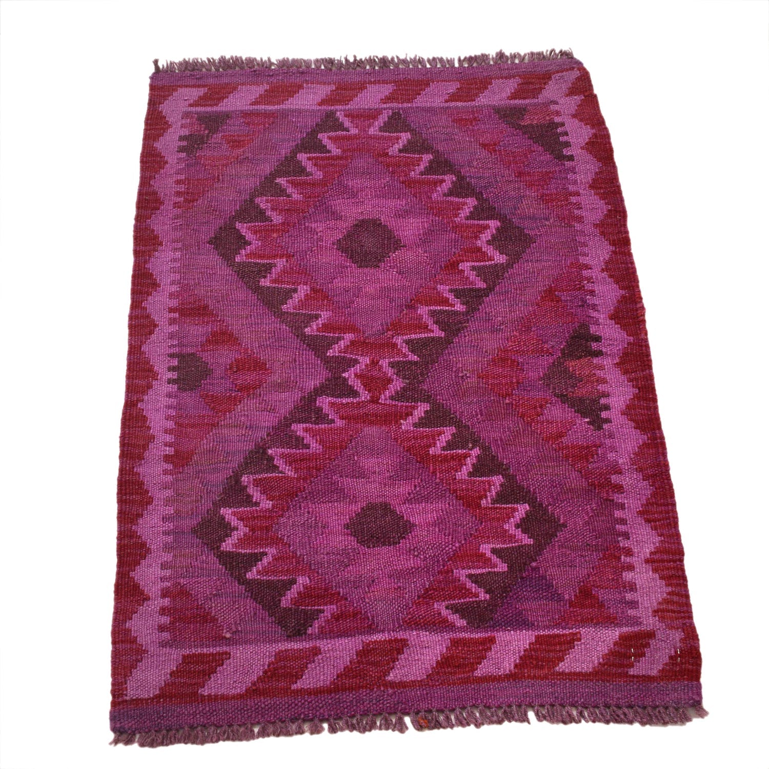 A Beautiful and versatile Oriental rug to decorate your home. This Overdyed Vegetable Kilim rug is durable and a good investment. It is in perfect condition. The traditional hand-knotted rug is made up of 100% Wool, and measures 1' 10" x 2' 9". It is a rectangle shape rug. The primary color is purple. The collection has the variety of Overdyed Vegetable Kilim carpets and runners. It is currently in stock. Available in geometric pattern and floral design. Free delivery from 4-6 business days.