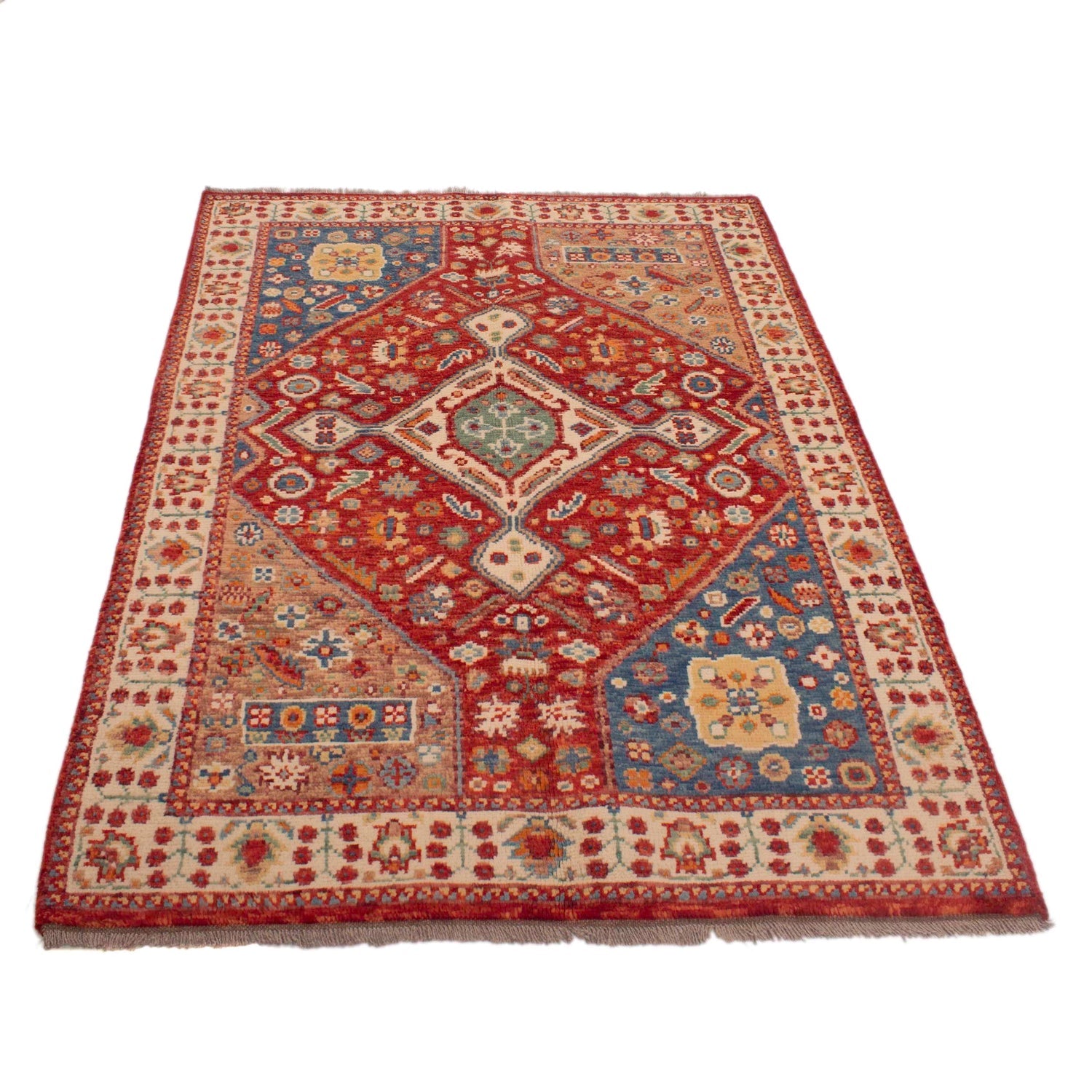 A Beautiful and versatile Oriental rug to decorate your home. This Shirazi rug is durable and a good investment. It is in perfect condition. The traditional hand-knotted rug is made up of 100% Wool, and measures 3' 9" x 5' 8". It is a rectangle shape rug. The primary color is red. The collection has the variety of Shirazi carpets and runners. It is currently in stock. Available in geometric pattern and floral design. Free delivery from 4-6 business days.