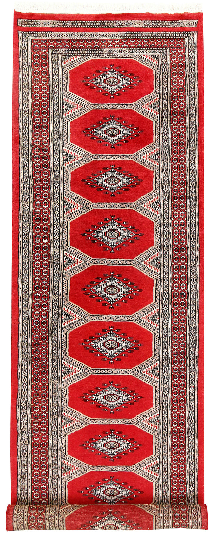 A Beautiful and versatile Oriental rug to decorate your home. This Jaldar rug is durable and a good investment. It is in perfect condition. The traditional hand-knotted rug is made up of new zealand worsted wool, and measures 2' 4" x 8' 10". It is a runner shape rug. The primary color is red . The collection has the variety of Jaldar carpets and runners. It is currently in stock. Available in geometric pattern and floral design. Free delivery from 4-6 business days.
