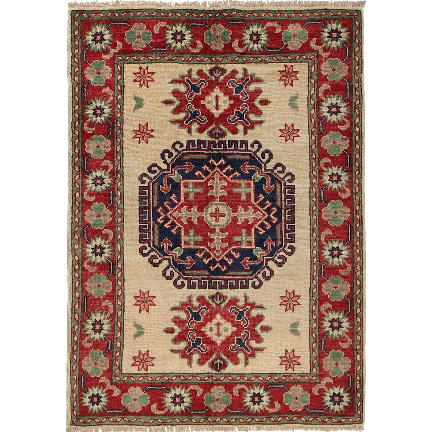 A Beautiful and versatile Oriental rug to decorate your home. This Kazak rug is durable and a good investment. It is in perfect condition. The traditional hand-knotted rug is made up of Wool on Cotton, and measures 2' 11" x 4' 1". It is a rectangle shape rug. The primary color is ivory. The collection has the variety of Kazak carpets and runners. It is currently in stock. Available in geometric pattern and floral design. Free delivery from 4-6 business days.