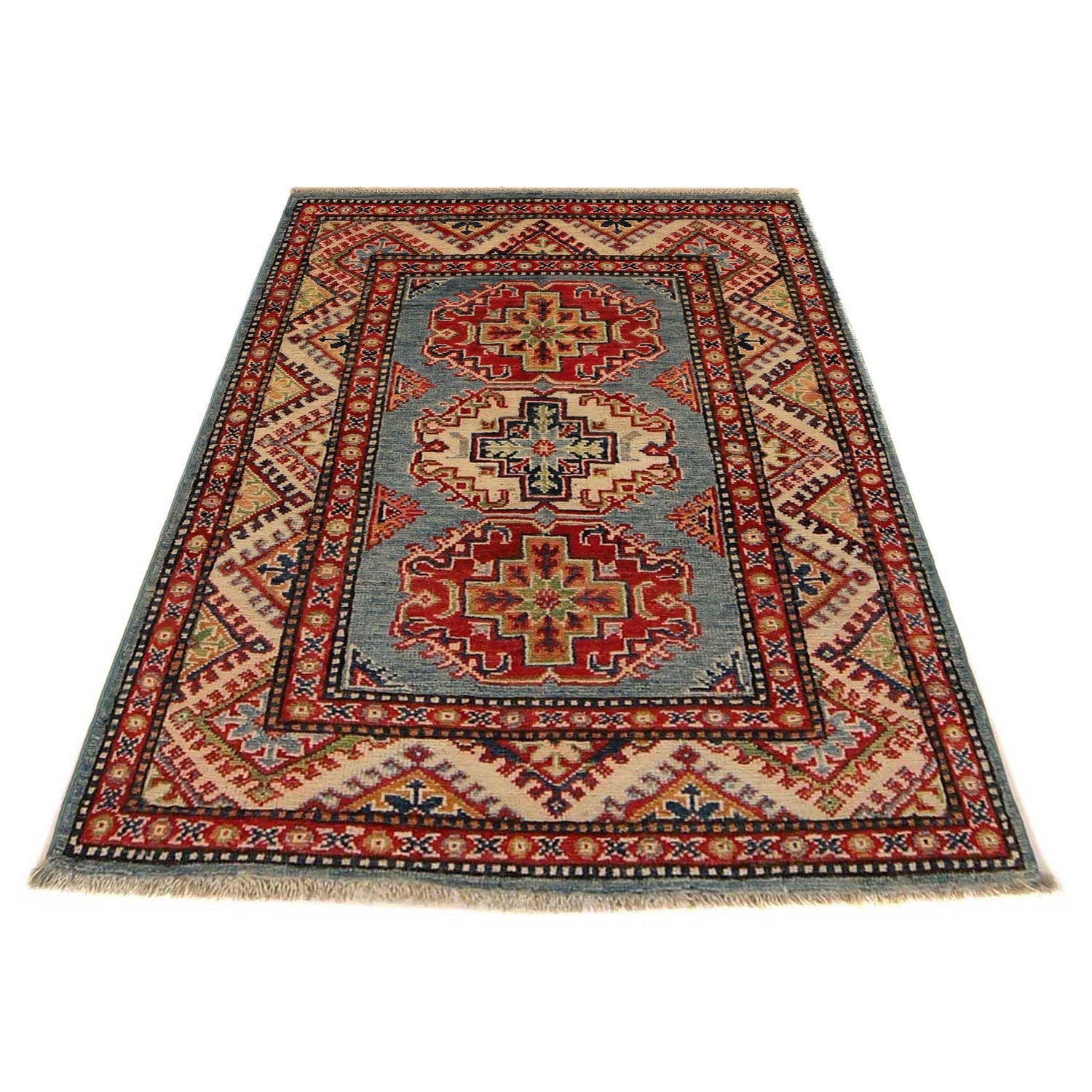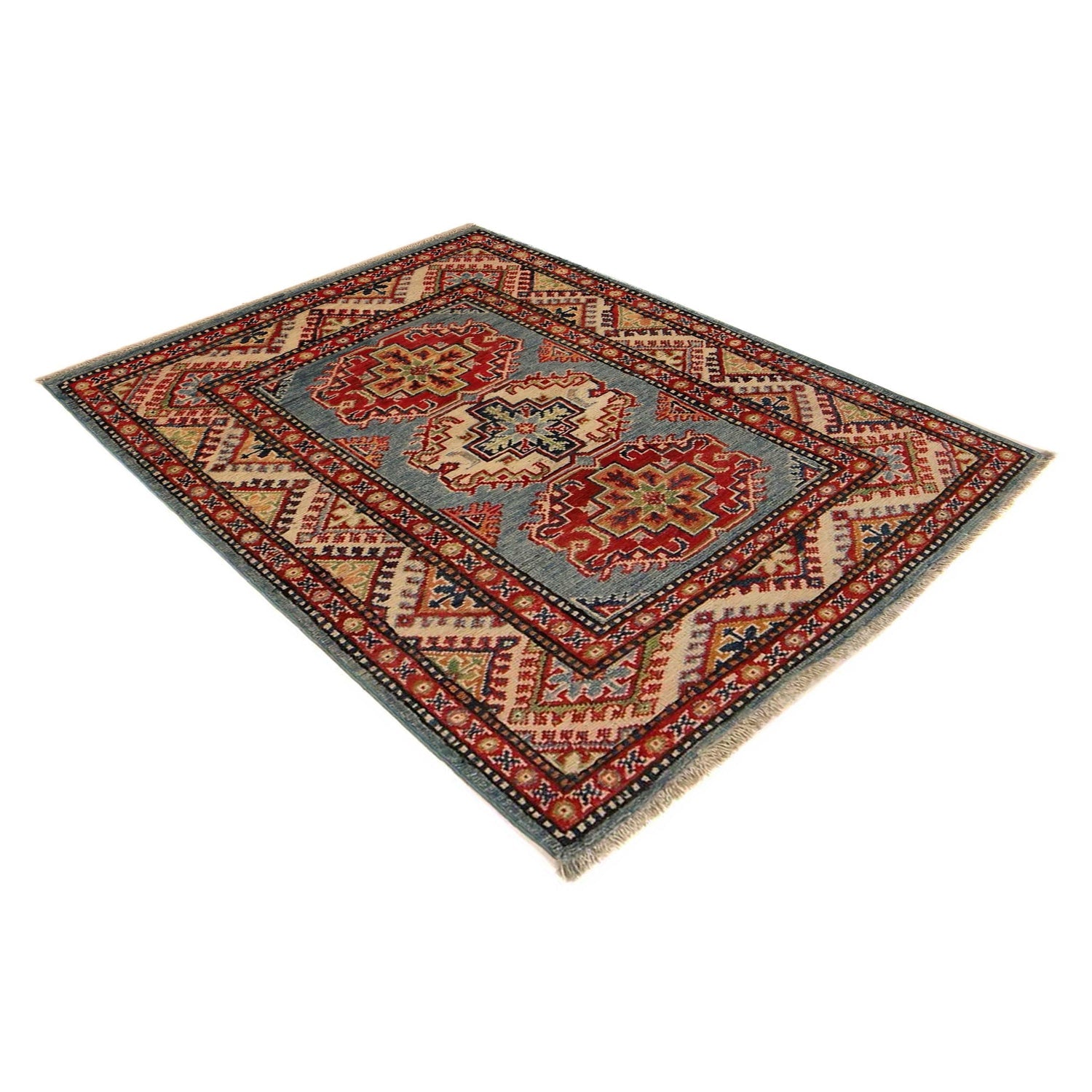 A Beautiful and versatile Oriental rug to decorate your home. This Kazak rug is durable and a good investment. It is in perfect condition. The traditional hand-knotted rug is made up of Wool on Cotton, and measures 2' 10" x 3' 11". It is a rectangle shape rug. The primary color is blue. The collection has the variety of Kazak carpets and runners. It is currently in stock. Available in geometric pattern and floral design. Free delivery from 4-6 business days.