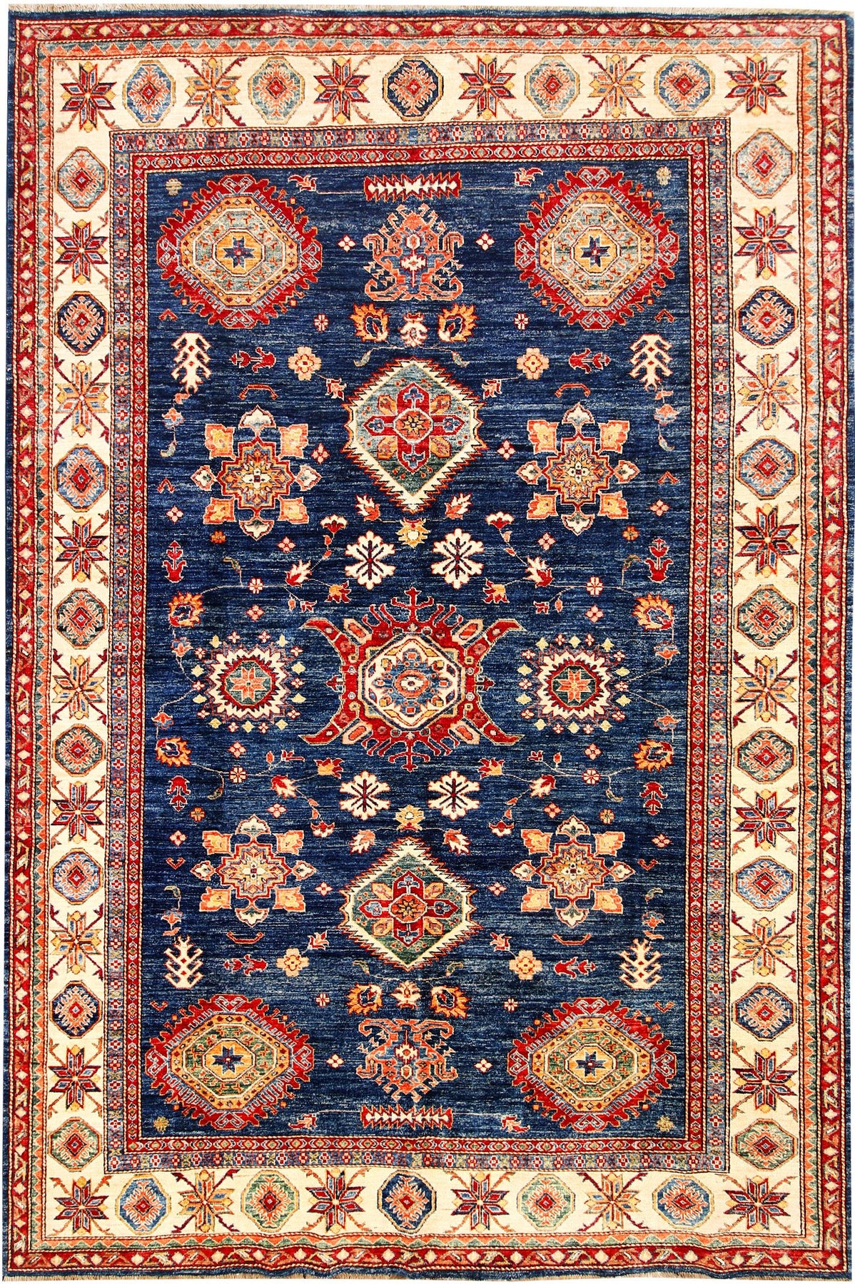 This Afghan Kazak design rug is hand-knotted with Wool on Cotton.