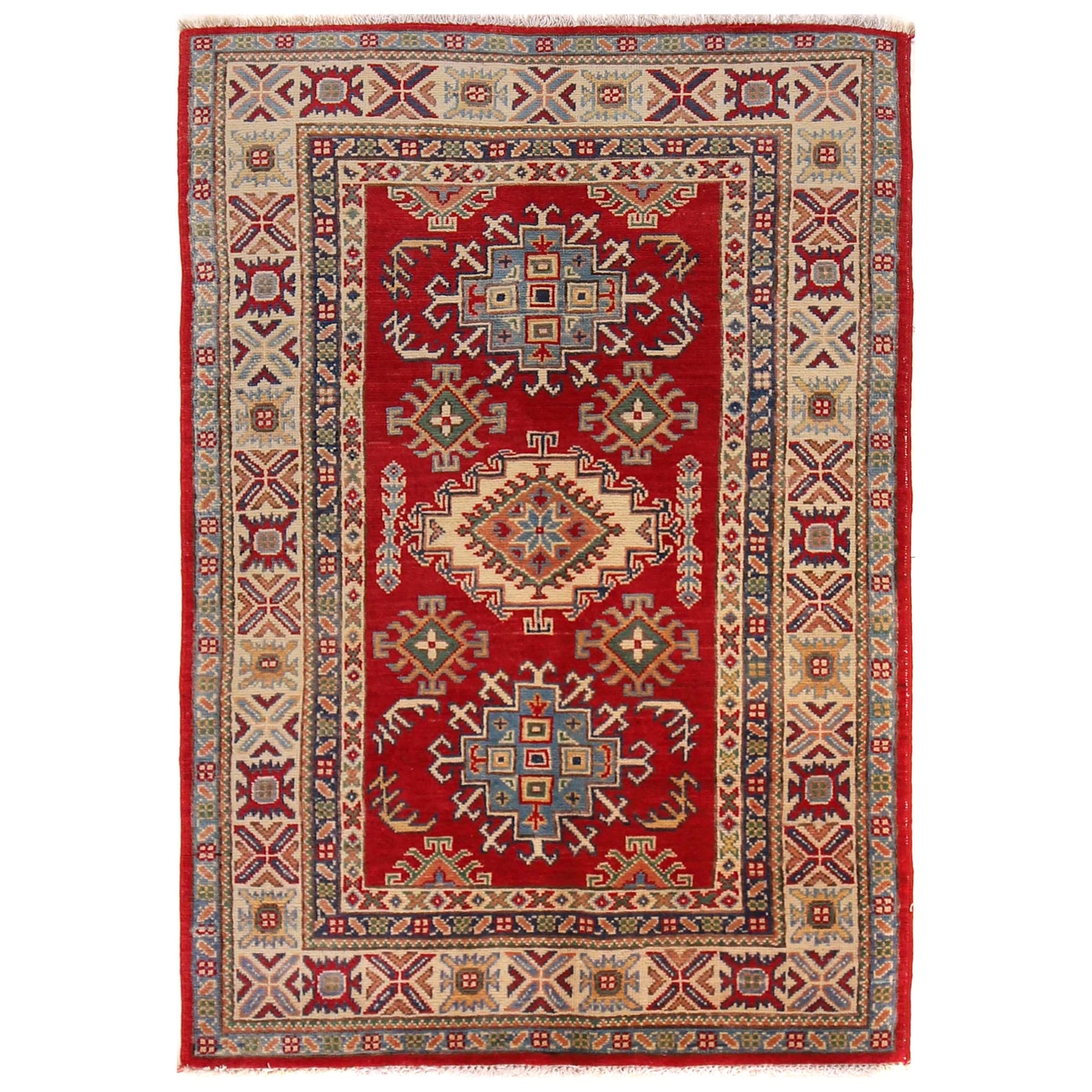 Make a bold statement with this magnificent hand-knotted Kazak rug. Measuring 3' 3" x 5' 2", this striking red rug is crafted from premium wool on cotton and showcases the powerful geometric medallions and vibrant colors that have made Kazak rugs legendary among collectors and design enthusiasts worldwide.