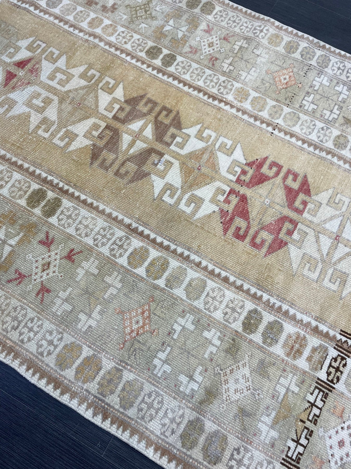 *A vintage handmade Turkish rug made of hand spun wool and double knotted on sturdy cotton foundation, professionally washed/cleaned and ready to be used for many more years.