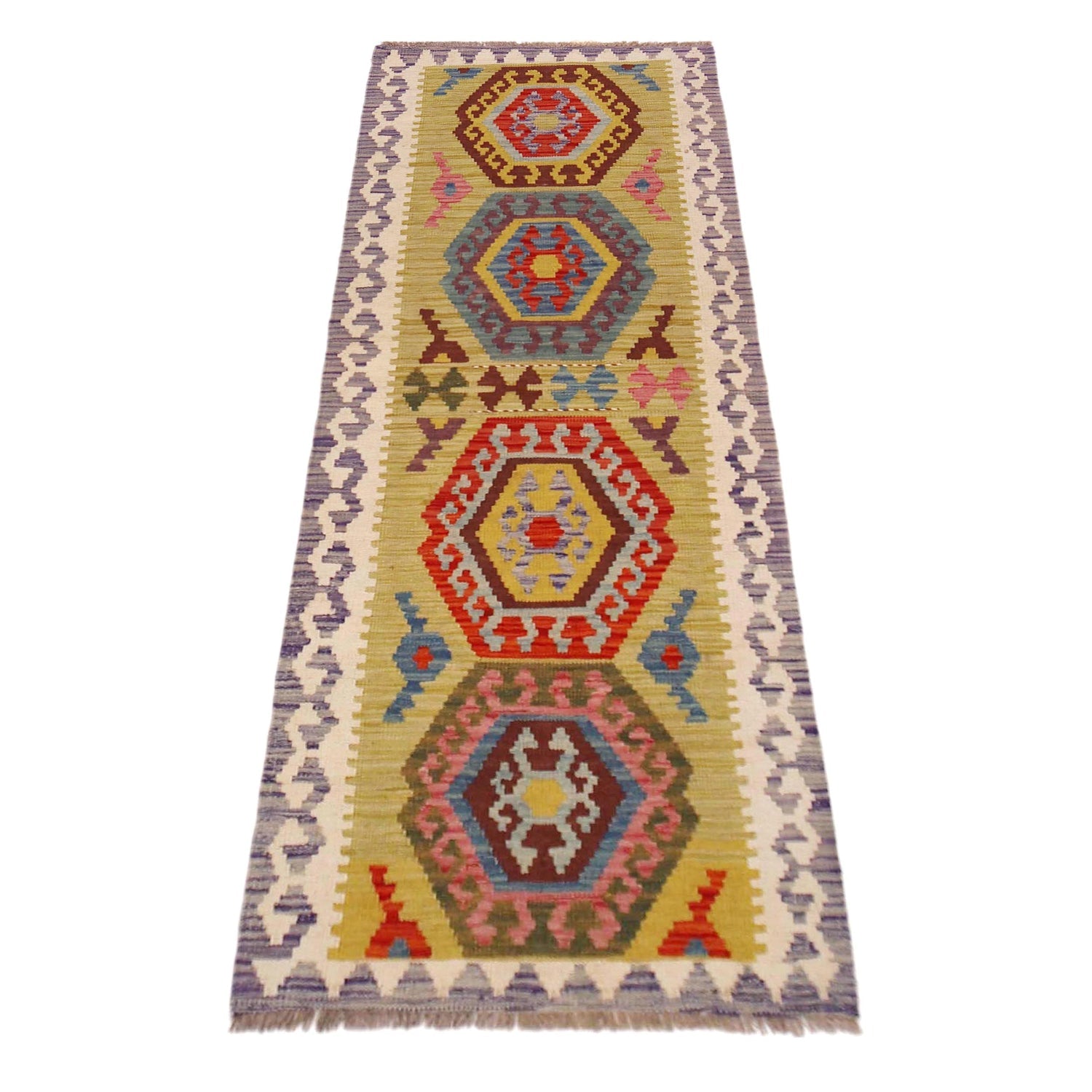 A Beautiful and versatile Oriental rug to decorate your home. This Vegetable Kilim rug is durable and a good investment. It is in perfect condition. The traditional hand-knotted rug is made up of 100% Wool, and measures 2' 2" x 6' 7". It is a rectangle shape rug. The primary color is multi. The collection has the variety of Vegetable Kilim carpets and runners. It is currently in stock. Available in geometric pattern and floral design. Free delivery from 4-6 business days.