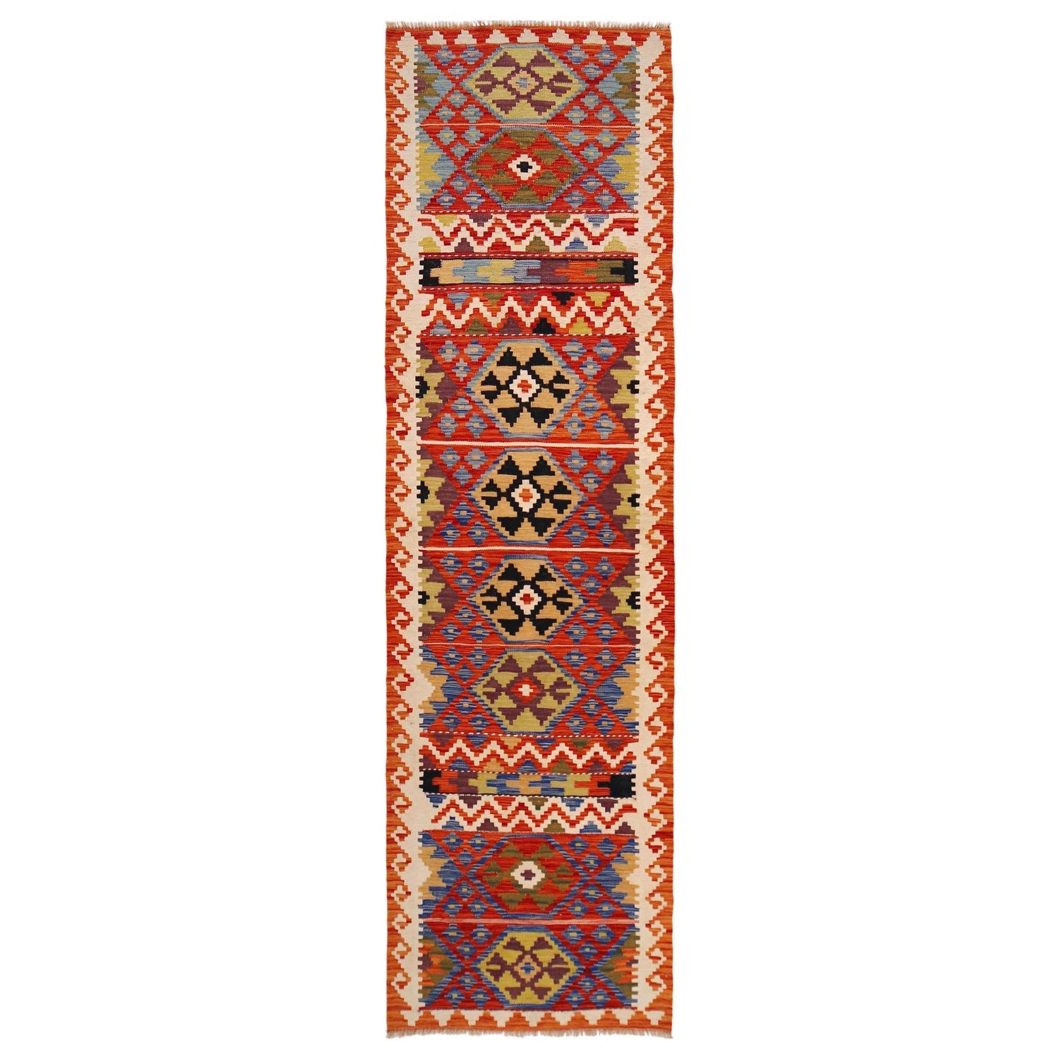 A Beautiful and versatile Oriental rug to decorate your home. This Vegetable Kilim rug is durable and a good investment. It is in perfect condition. The traditional hand-knotted rug is made up of 100% Wool, and measures 2' 8" x 9' 10". It is a rectangle shape rug. The primary color is multi. The collection has the variety of Vegetable Kilim carpets and runners. It is currently in stock. Available in geometric pattern and floral design. Free delivery from 4-6 business days.