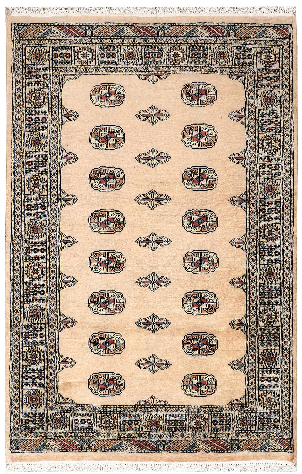 Filled with symbolic patterns and ancient designs, handmade Bisque Bokhara 4' x 6' Rectangle rugs can direct attention towards themselves like nothing else!