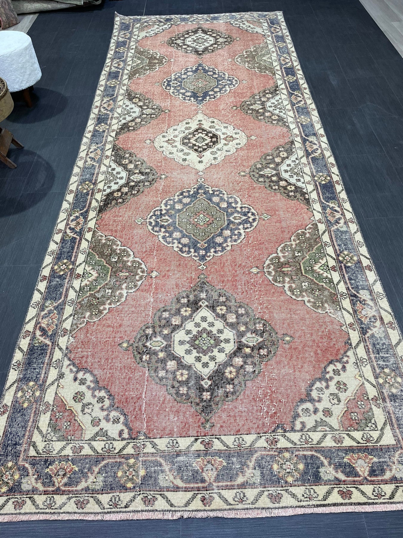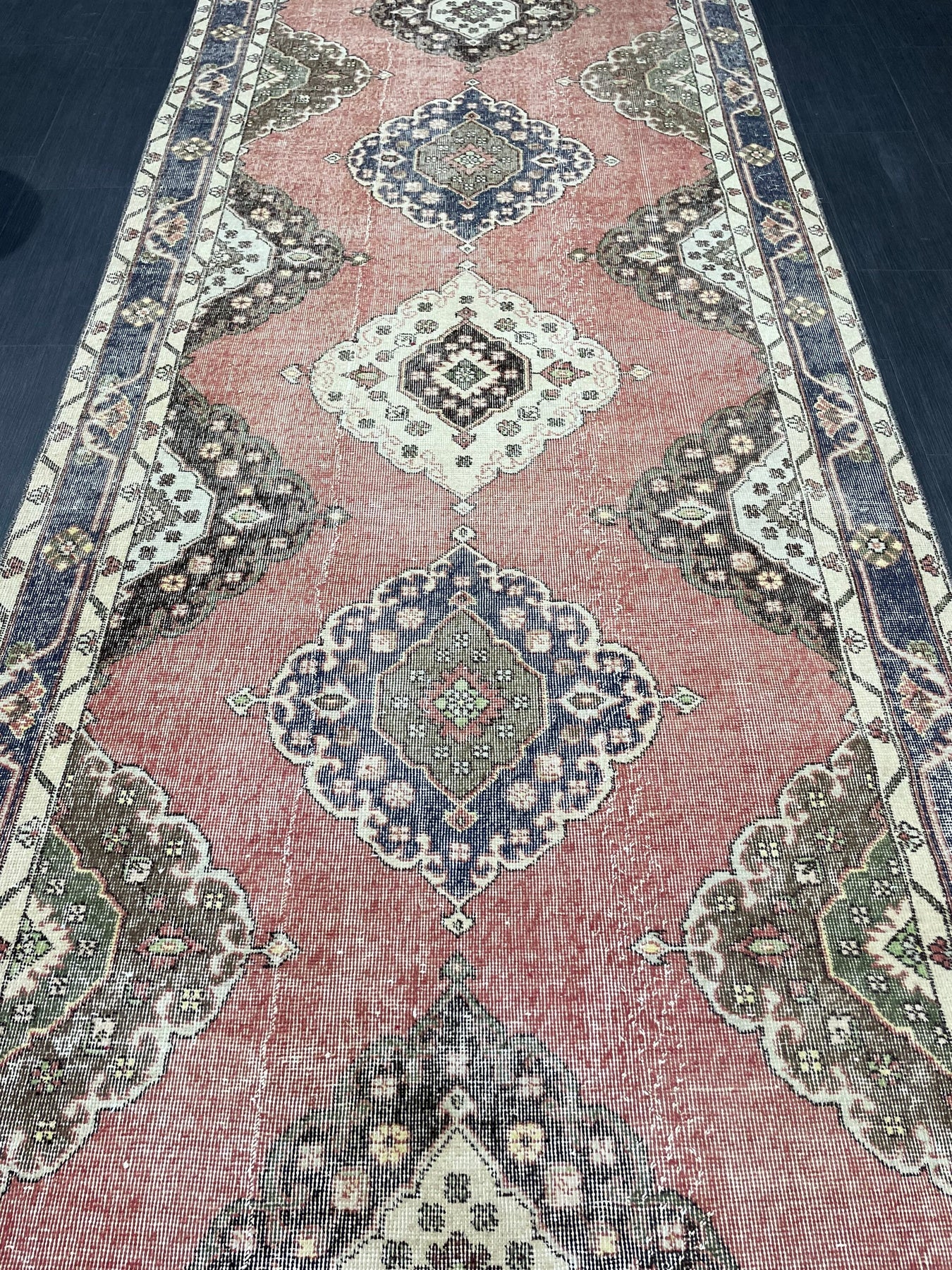 142 x 378 cm 56 x 148 inches THIS WOOL RUNNER RUG IS A PIECE OF ART FROM CENTRAL ANATOLIA WITH TRADITIONAL PATTERN, HAND SPUN WOOL , NATURAL DYES , AND VINTAGE FROM A WHOLESALER IN KONYA NATURAL WOOL AND NATURAL COTTON FOUNDATION HIGH QUALITY, ORIGINAL PIECES TURKISH RUGS WITH TRADITIONAL PATTERNS AND HAND WORK WITH UPDATED APPEARANCE FOR A UNIQUE STATEMENT PIECE IDEAL FOR SOMEONE WHO IS LOOKING FOR SOMETHING MORE THAN ORDINARY.