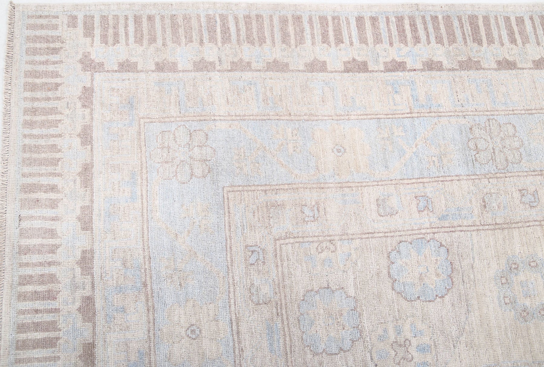 Khotan carpets come in a wide range of hues and patterns, although Ivory, taupe, beige and blue tones are the most typical ones. Tribal ornamental designs can also be seen on some Khotan carpets; these motifs are frequently woven into the rug's background and borders.
