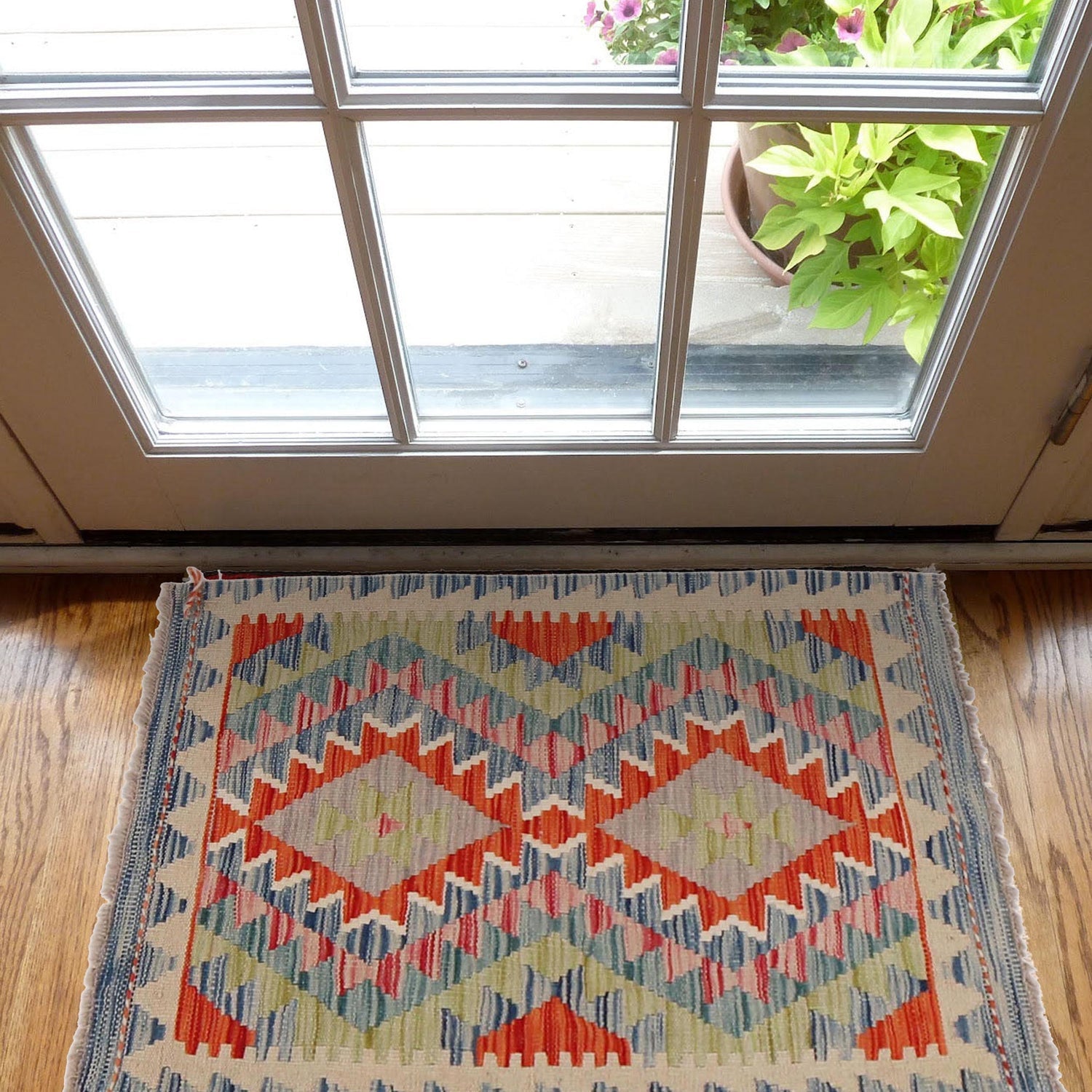 A Beautiful and versatile Oriental rug to decorate your home. This Vegetable Kilim rug is durable and a good investment. It is in perfect condition. The traditional hand-knotted rug is made up of 100% Wool, and measures 2' 0" x 2' 11". It is a rectangle shape rug. The primary color is multi. The collection has the variety of Vegetable Kilim carpets and runners. It is currently in stock. Available in geometric pattern and floral design. Free delivery from 4-6 business days.