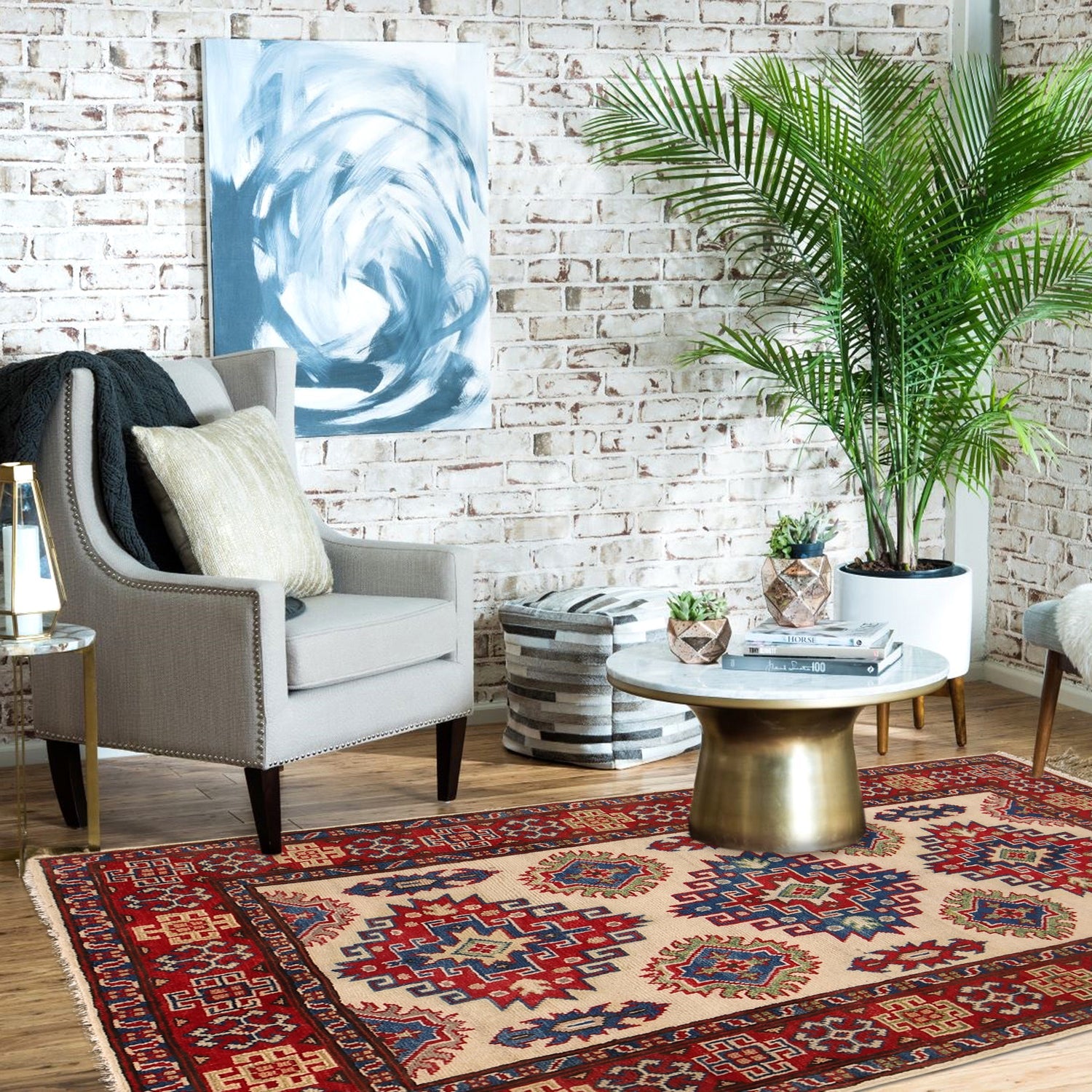 A Beautiful and versatile Oriental rug to decorate your home. This Kazak rug is durable and a good investment. It is in perfect condition. The traditional hand-knotted rug is made up of Wool on Cotton, and measures 3' 3" x 4' 9". It is a rectangle shape rug. The primary color is ivory. The collection has the variety of Kazak carpets and runners. It is currently in stock. Available in geometric pattern and floral design. Free delivery from 4-6 business days.