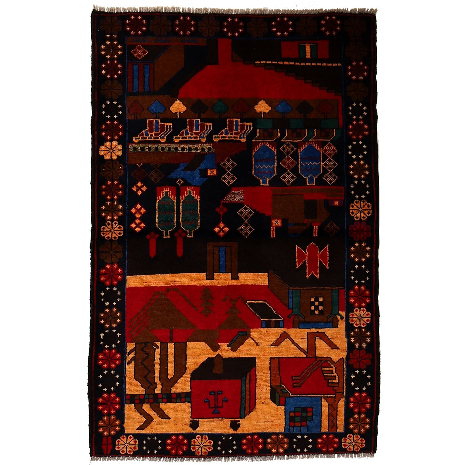 A Beautiful and versatile Oriental rug to decorate your home. This Pictorial rug is durable and a good investment. It is in perfect condition. The traditional hand-knotted rug is made up of 100% Wool, and measures 3' 0" x 4' 8". It is a rectangle shape rug. The primary color is multi . The collection has the variety of Pictorial carpets and runners. It is currently in stock. Available in geometric pattern and floral design. Free delivery from 4-6 business days.