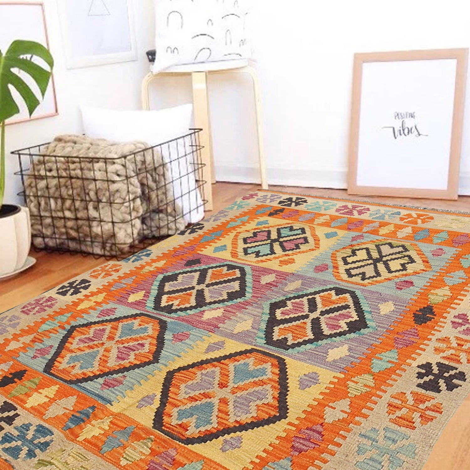 A Beautiful and versatile Oriental rug to decorate your home. This Vegetable Kilim rug is durable and a good investment. It is in perfect condition. The traditional hand-knotted rug is made up of 100% Wool, and measures 3' 7" x 4' 9". It is a rectangle shape rug. The primary color is multi. The collection has the variety of Vegetable Kilim carpets and runners. It is currently in stock. Available in geometric pattern and floral design. Free delivery from 4-6 business days.