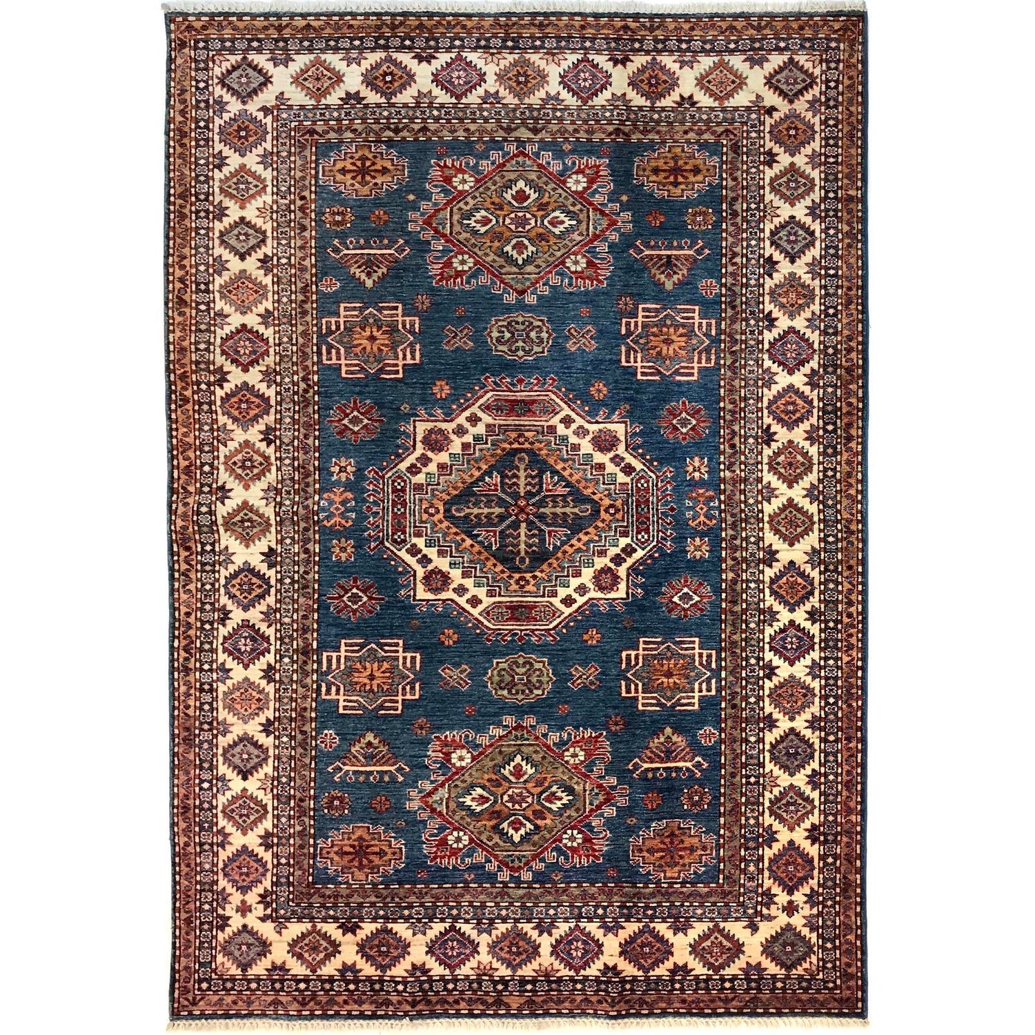 A Beautiful and versatile Oriental rug to decorate your home. This Kazak rug is durable and a good investment. It is in perfect condition. The traditional hand-knotted rug is made up of Wool on Cotton, and measures 5' 5" x 7' 9". It is a rectangle shape rug. The primary color is blue. The collection has the variety of Kazak carpets and runners. It is currently in stock. Available in geometric pattern and floral design. Free delivery from 4-6 business days.