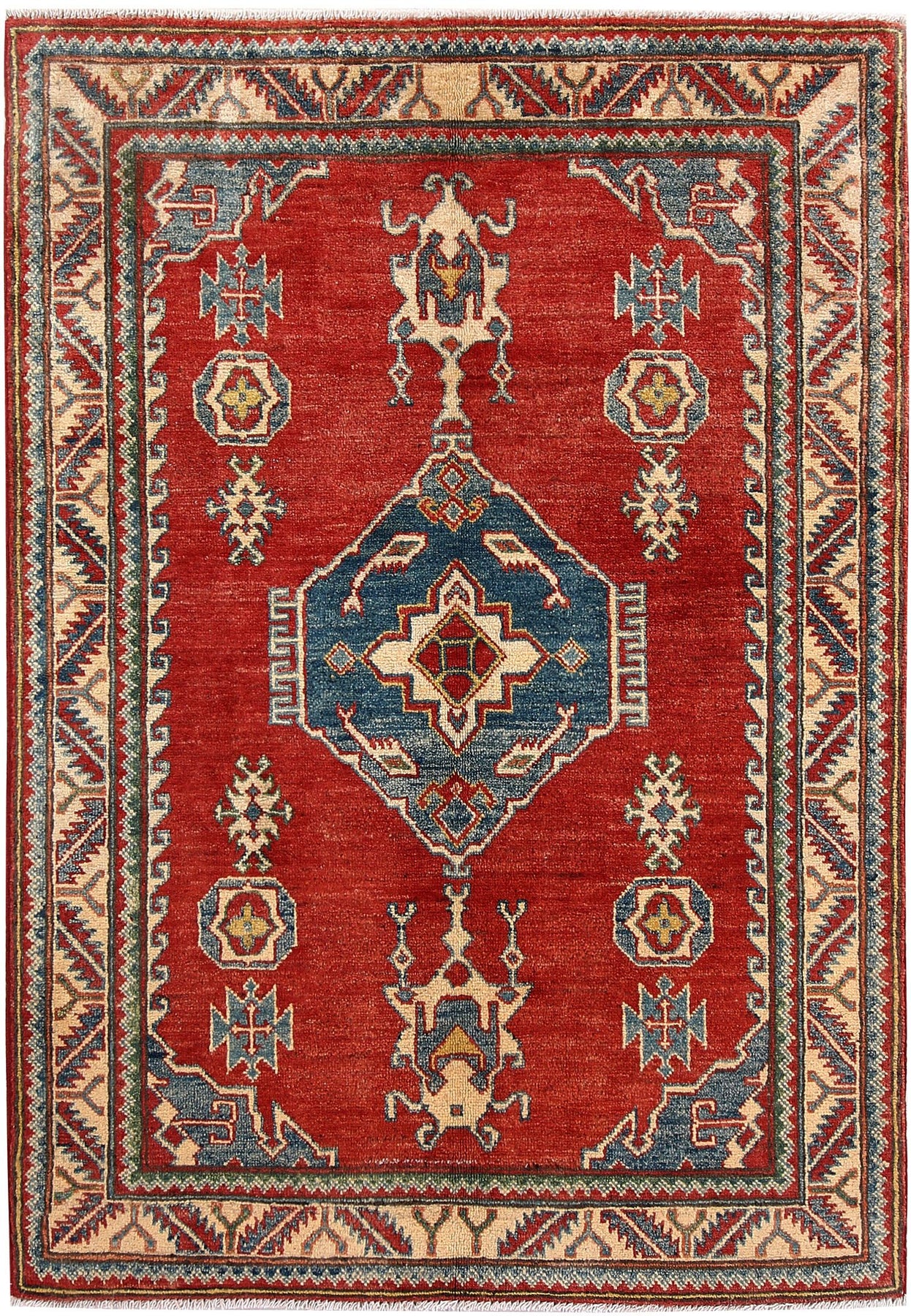 This Afghan Kazak design rug is hand-knotted with Wool on Cotton.