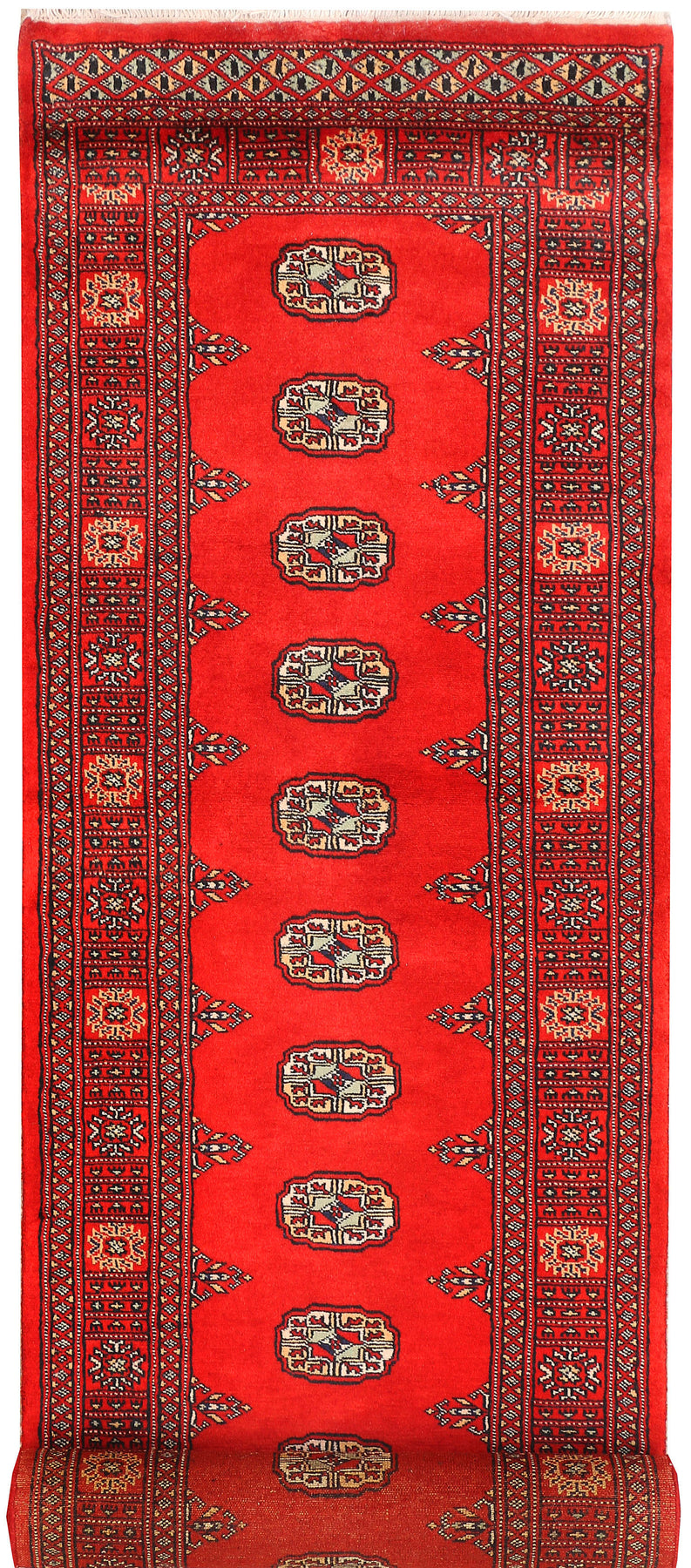 This red Bokhara Hand-Knotted Rug is a true expression of the soul. This red Bokhara Rug measures 2' 7" x 12' " and will bring warmth to any space. For a luxurious look, this piece is hand-knotted from 100% wool. Its intricate patterns often feature Persian symbols, which can carry cultural nuances. The striking coral color will make your home look irresistible. Your home should be elegant and cozy. This Particular Rug from Alrug is one of our stunning Pakistani rugs. These rugs are great for living rooms, bedrooms, and dining rooms. They can be used in all rooms of the house, so they aren't limited to these areas. Its simple, yet striking design will bring beauty and color to any room you enter. Get this beauty now from Alrug with Free Shipping!